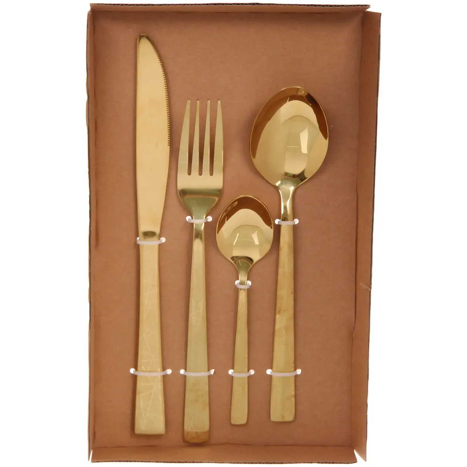 Каждый прибор в наборе имеет стандартные размеры, что делает их удобными для использования. Упаковка выполнена в коричневом цвете с прозрачным окном, что позволяет увидеть содержимое. Набор упакован в картонную коробку, что делает его отличным вариантом для подарка.