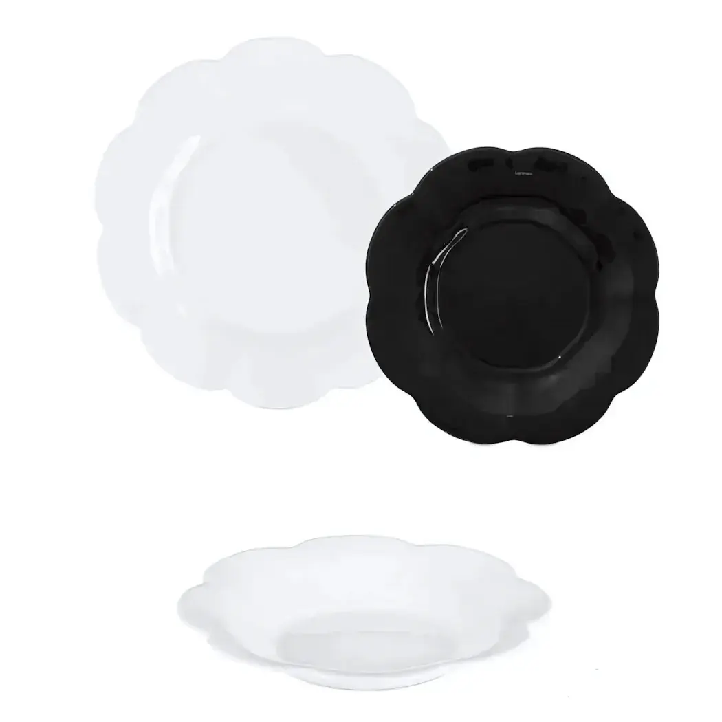 В набор входят блюда различных форм: два цветоковидных и одно гладкое, что позволяет сервировать стол с учетом ваших предпочтений. Белый и черный цвета создают контраст, который добавляет изысканности. Размеры предметов идеально подходят для подачи как закусок, так и основных блюд.