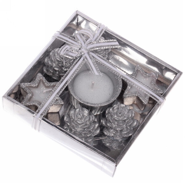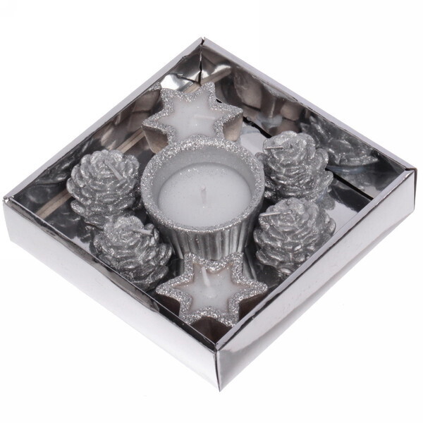 Свечи в наборе представлены в различных формах: одна круглая, две звездочки и три шишки. Такой разнообразный дизайн позволяет использовать их в различных композициях, будь то праздничный стол, уютный вечер или просто для декора. Они идеально подходят для использования в качестве украшения на Новый год, дни рождения или другие торжества.