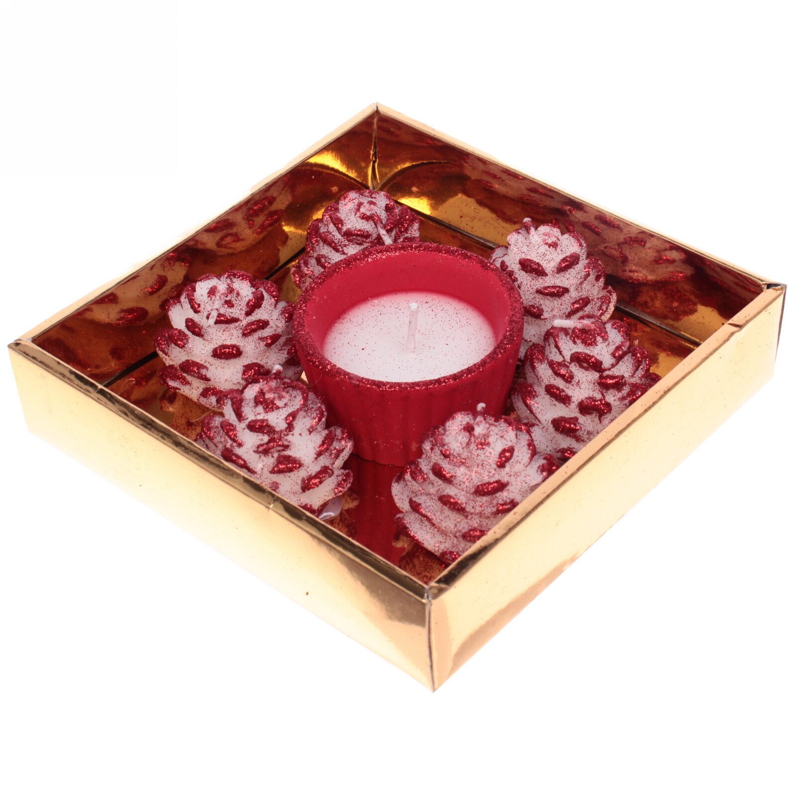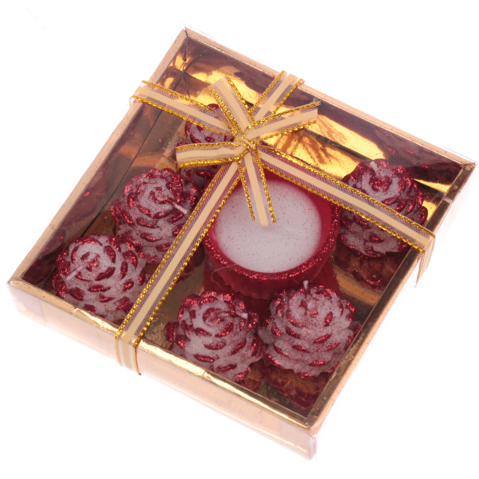 - 6 свечей-роз с блестящим покрытием и центральная круглая свеча