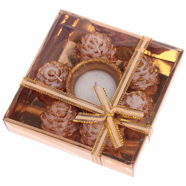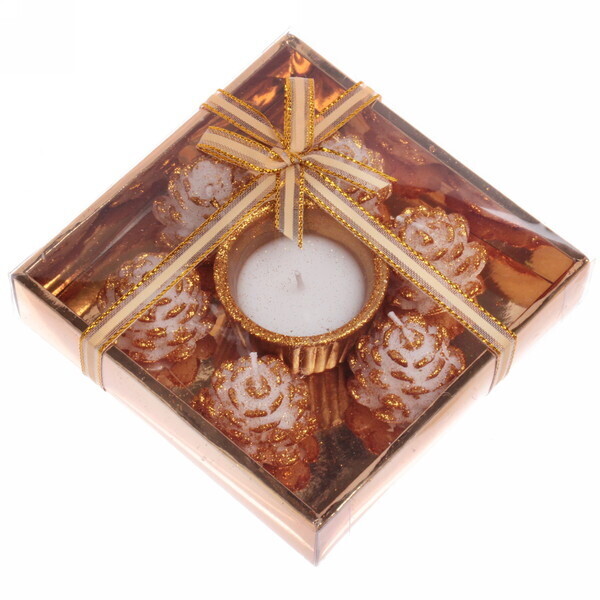 Размеры набора составляют 14х14х3 см, что делает его компактным и удобным для хранения. Свечи имеют округлую форму и размер, примерно равный обычному чайному светильнику. Упаковка перевязана золотистой лентой, что придаёт ей праздничный вид.