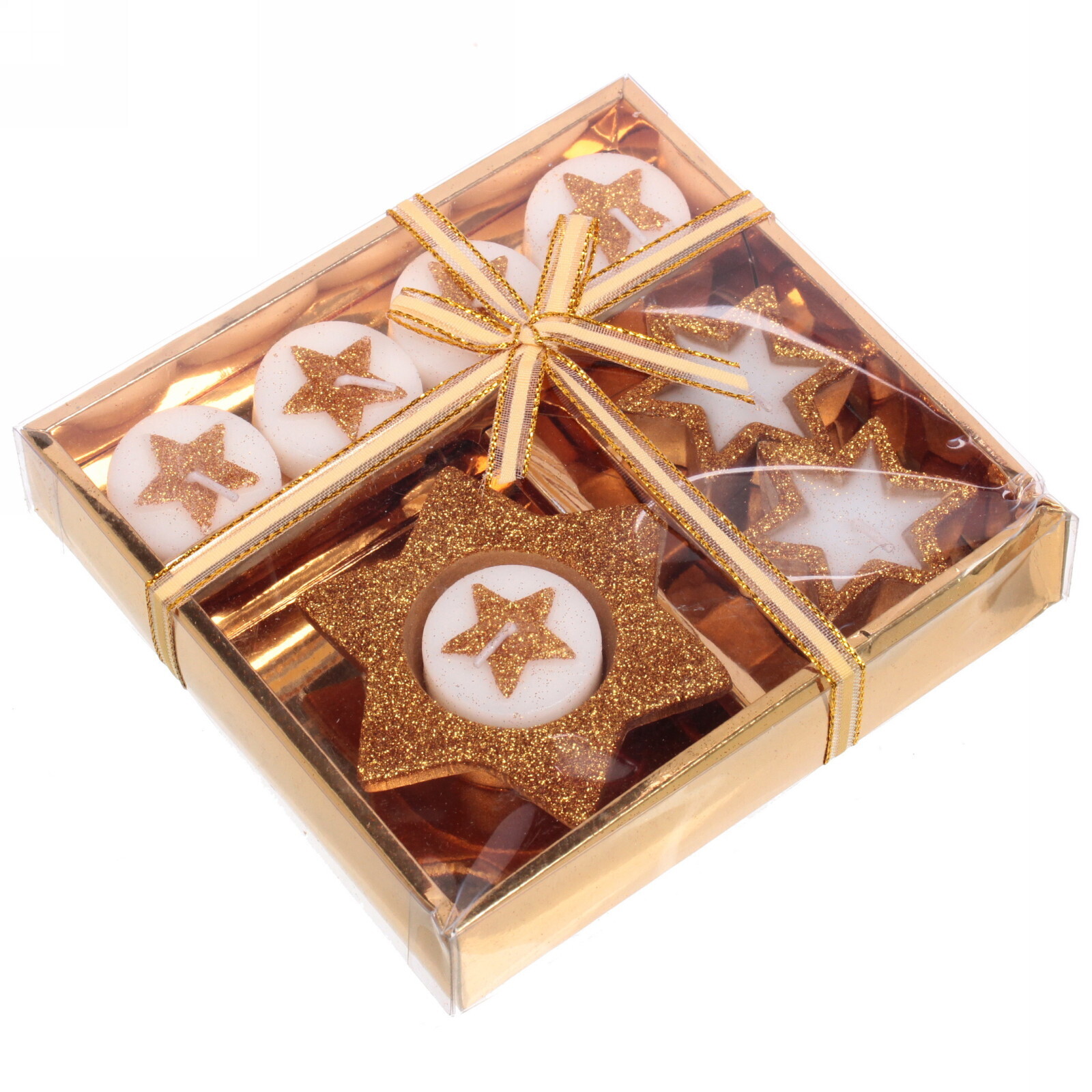 Размеры набора составляют 16,5х15,5х3 см, что делает его компактным и удобным для хранения. Свечи выполнены в белом и золотом цветах, что позволяет им гармонично вписаться в любой интерьер. Упаковка в виде квадратной коробки с блестящей лентой делает набор отличным вариантом для подарка.