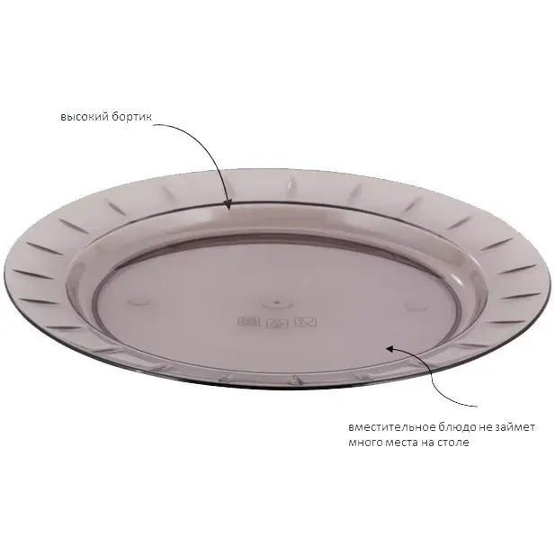 Прозрачная поверхность визуально увеличивает порции, делая сервировку эффектной. Не используйте для разогрева в СВЧ-печи и не подвергайте термическому воздействию выше +80°C. Для сохранения блеска протирайте мягкой губкой без абразивных средств.