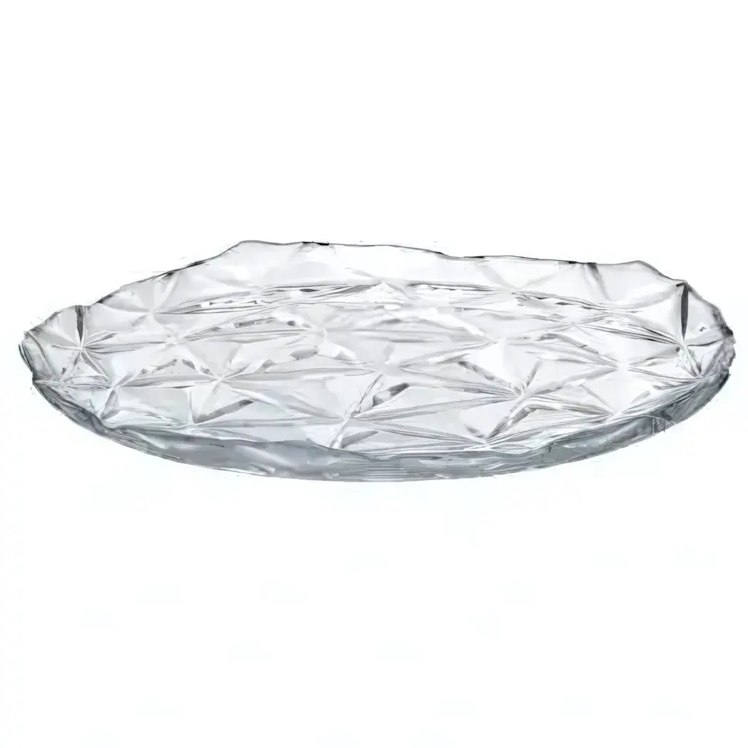 Набор из 6 прозрачных стеклянных тарелок с рельефным геометрическим узором станет украшением любого стола. Волнистые края и игра света на гранях создают эффект драгоценного хрусталя, подчеркивая ваше чувство стиля.