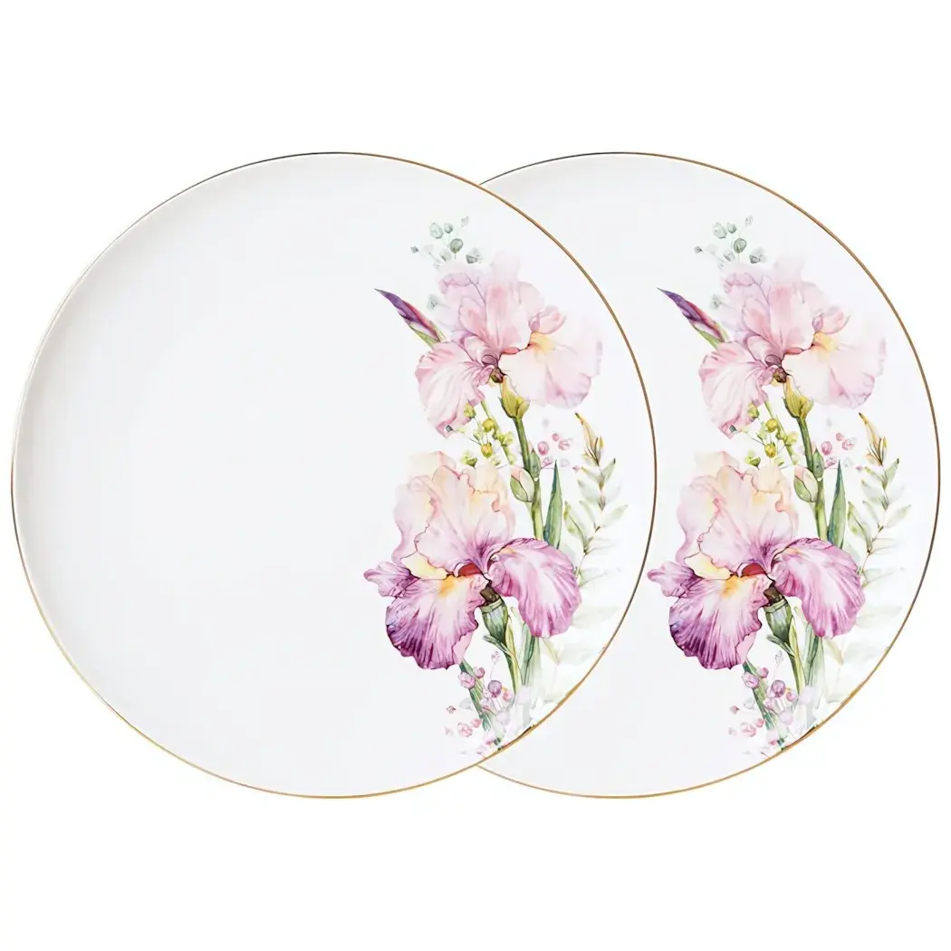 Тарелки имеют классическую круглую форму и выполнены в белом цвете с цветочным узором в нежных розовых и фиолетовых тонах. Обратите внимание, что их нельзя ставить в микроволновую печь и не рекомендуется мыть в посудомоечной машине, чтобы сохранить их первозданный вид. Упаковка с цветочным дизайном делает набор отличным подарком, который будет радовать ваших близких.