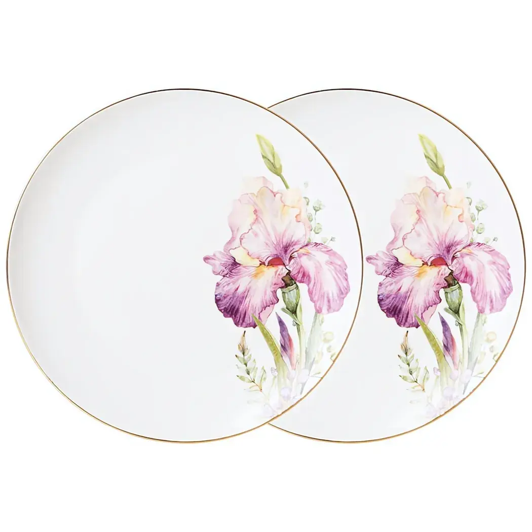 Тарелки оформлены в белом цвете с изящным изображением ирисов в розово-фиолетовых тонах и тонкой золотой каймой, что придаёт им особую изысканность. Упаковка также выполнена с любовью и заботой о деталях, что делает набор отличным подарком для ваших близких. Порадуйте себя и своих гостей стильной посудой, которая станет настоящим украшением вашего стола!