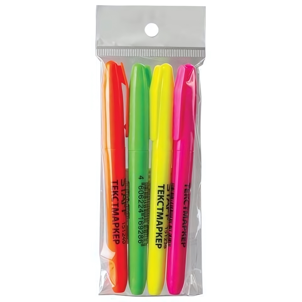 Набор текстовыделителей Staff станет вашим надежным помощником для работы с документами, учебными материалами или заметками. Четыре насыщенных неоновых цвета помогут эффективно организовать информацию, а светоустойчивые чернила сохранят маркировку даже на открытом свету.