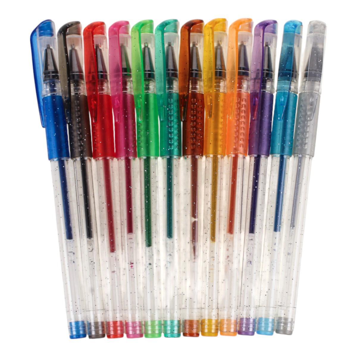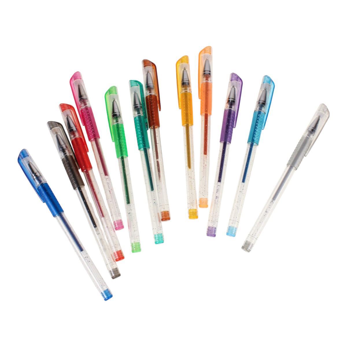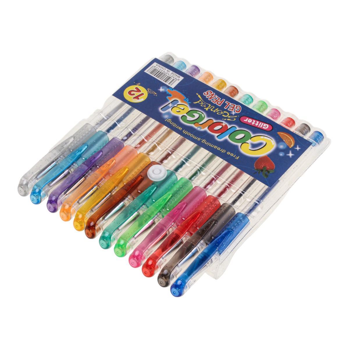 Набор включает 12 гелевых ручек различных цветов: фиолетовые, зелёные, оранжевые, розовые, голубые, жёлтые, коричневые и прозрачные с блёстками. Упаковка выполнена из прозрачного материала, что позволяет видеть содержимое. Размеры ручек стандартные для канцелярских принадлежностей, что делает их удобными для использования в любых условиях.