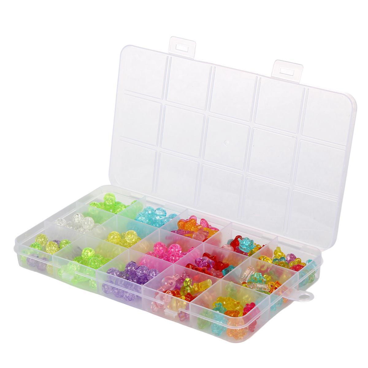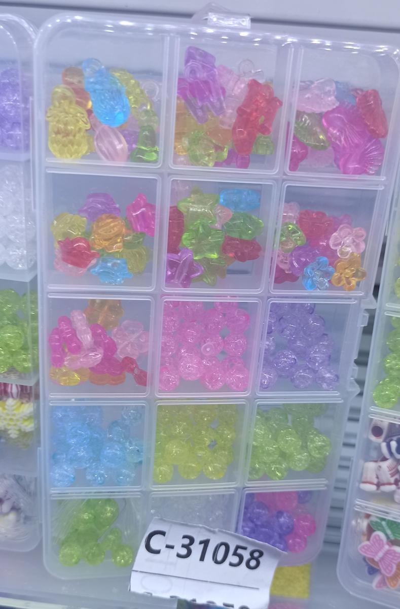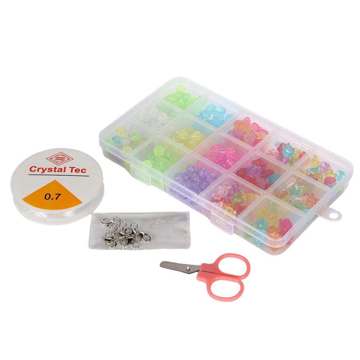 В комплект входят разноцветные прозрачные бусины различных форм (цветы, звездочки, мишки), прочная нить Crystal Tec 0.7, металлические замковые кольца и удобные ножницы. Все материалы аккуратно организованы в практичной пластиковой коробке с прозрачной крышкой размером 10х17 см.