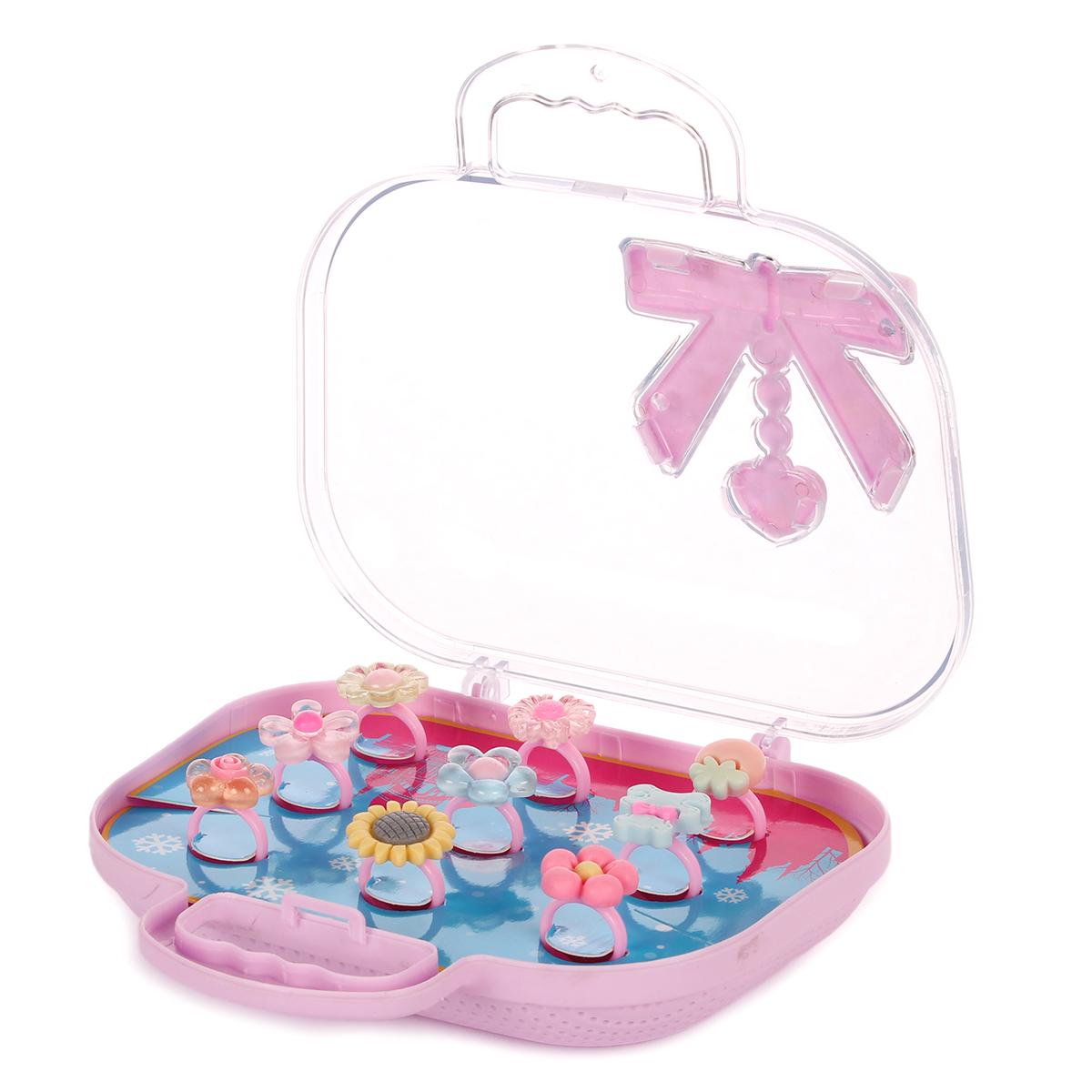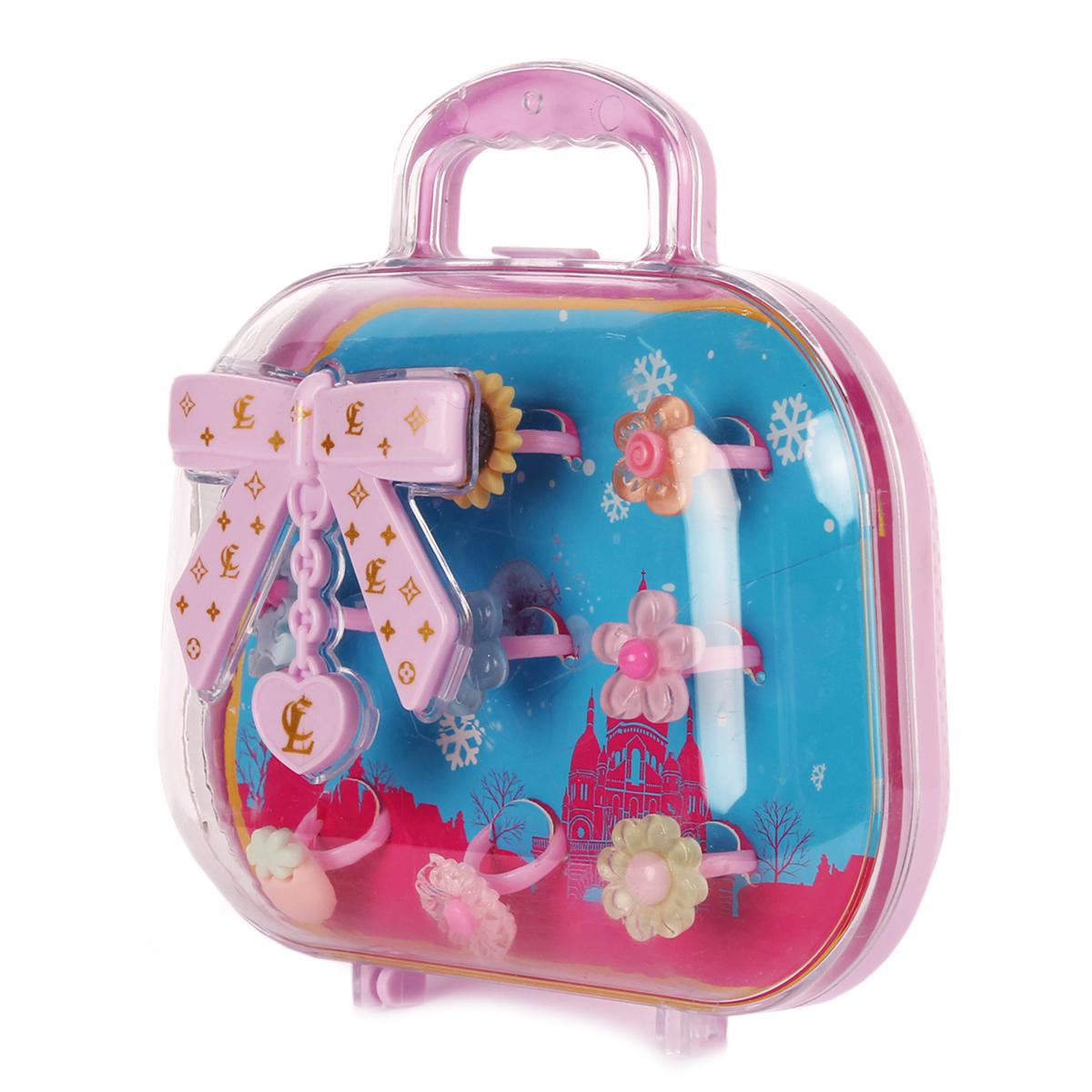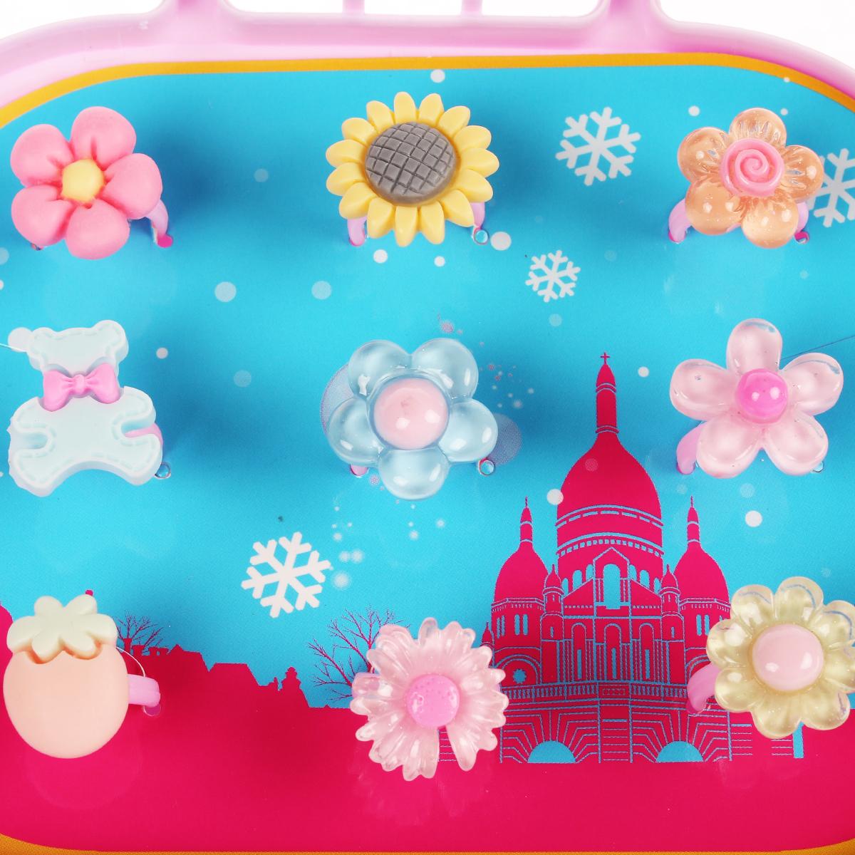 Размер упаковки составляет 25,8х17х38,4 см, что делает его компактным и удобным для хранения. Яркие цвета и оригинальный дизайн упаковки привлекут внимание и сделают процесс выбора украшений увлекательным. Набор включает в себя не только кольца, но и другие аксессуары, такие как заколки и резинки для волос, оформленные в виде цветов и других декоративных элементов.