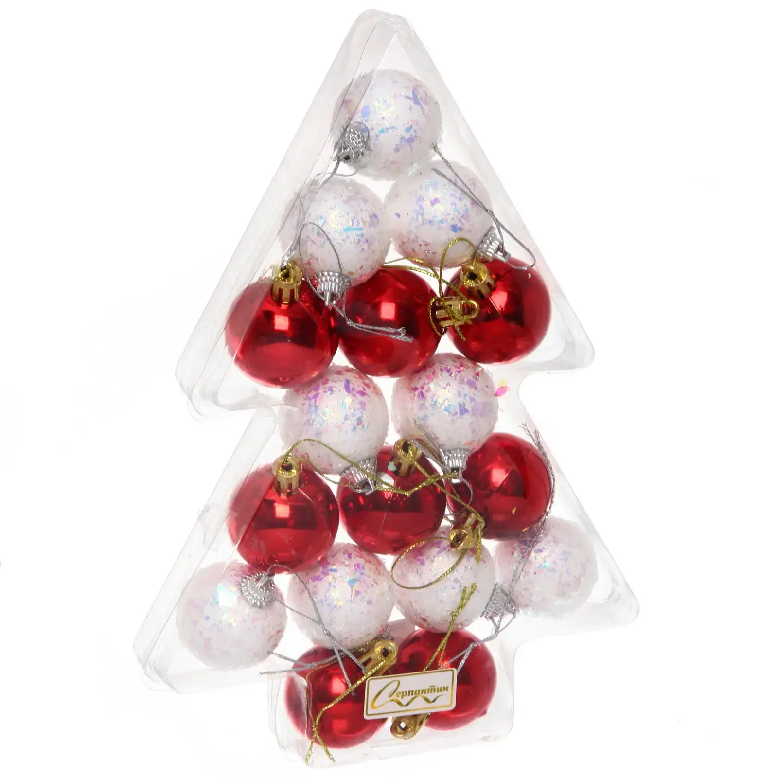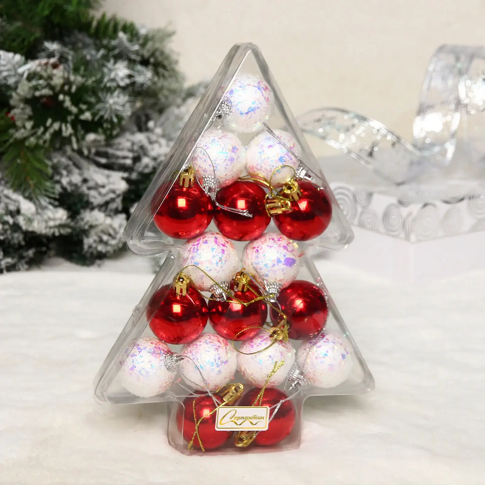 Технические детали: диаметр каждого шара составляет 4 см, материалы - высококачественный пластик. В наборе представлено два варианта исполнения: глянцевые красные шары и белые шары с многоцветными блестками.