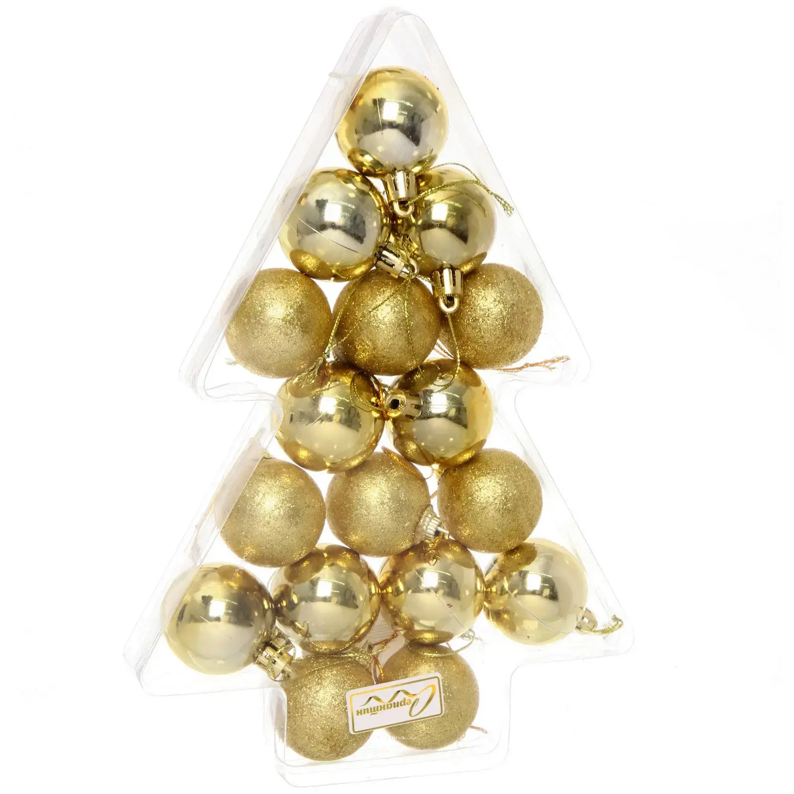 Создайте сияющий образ новогодней ёлки с профессионально подобранным комплектом шаров. Набор из 17 золотых украшений сочетает матовые и глянцевые поверхности, создавая эффект живого мерцания при свете гирлянд.
