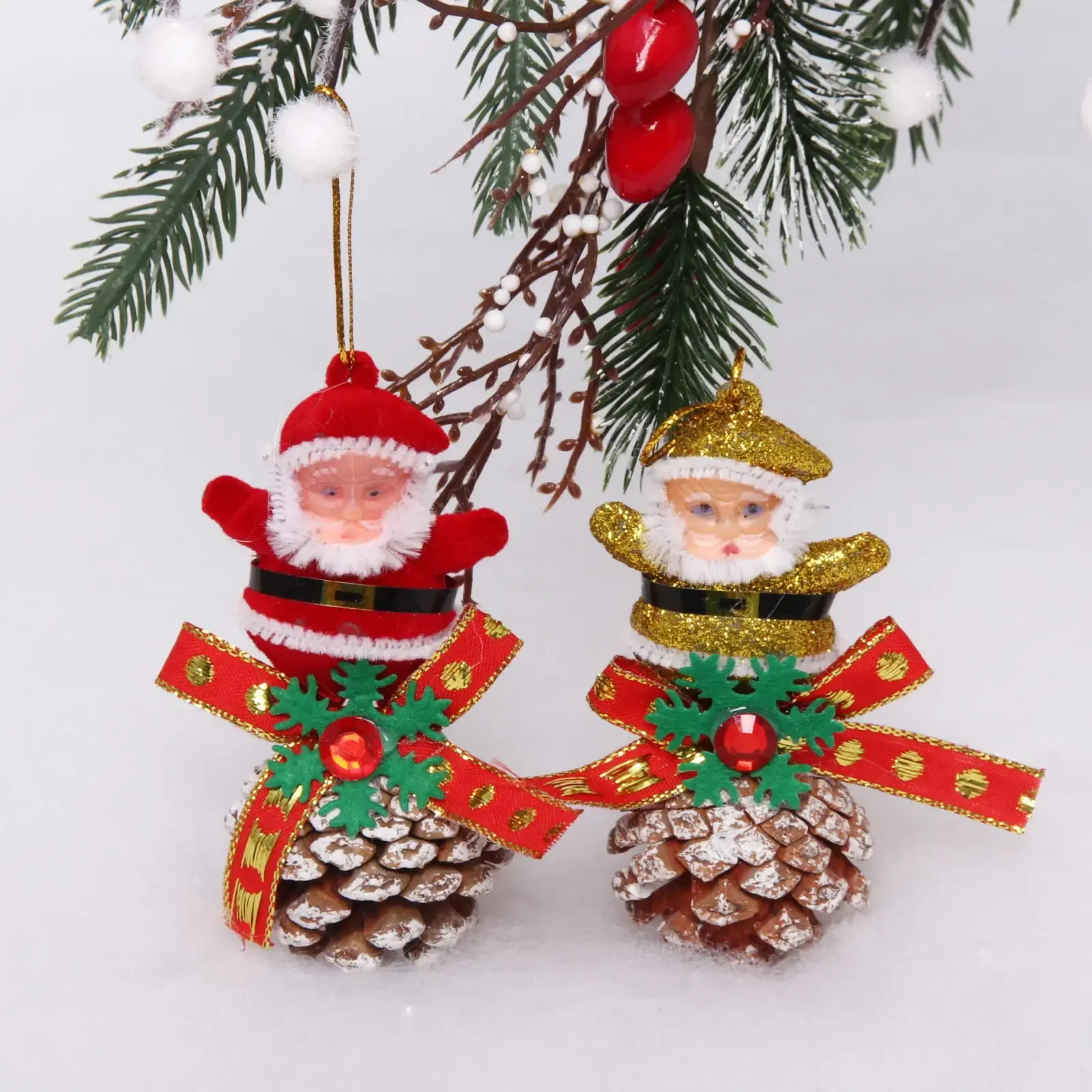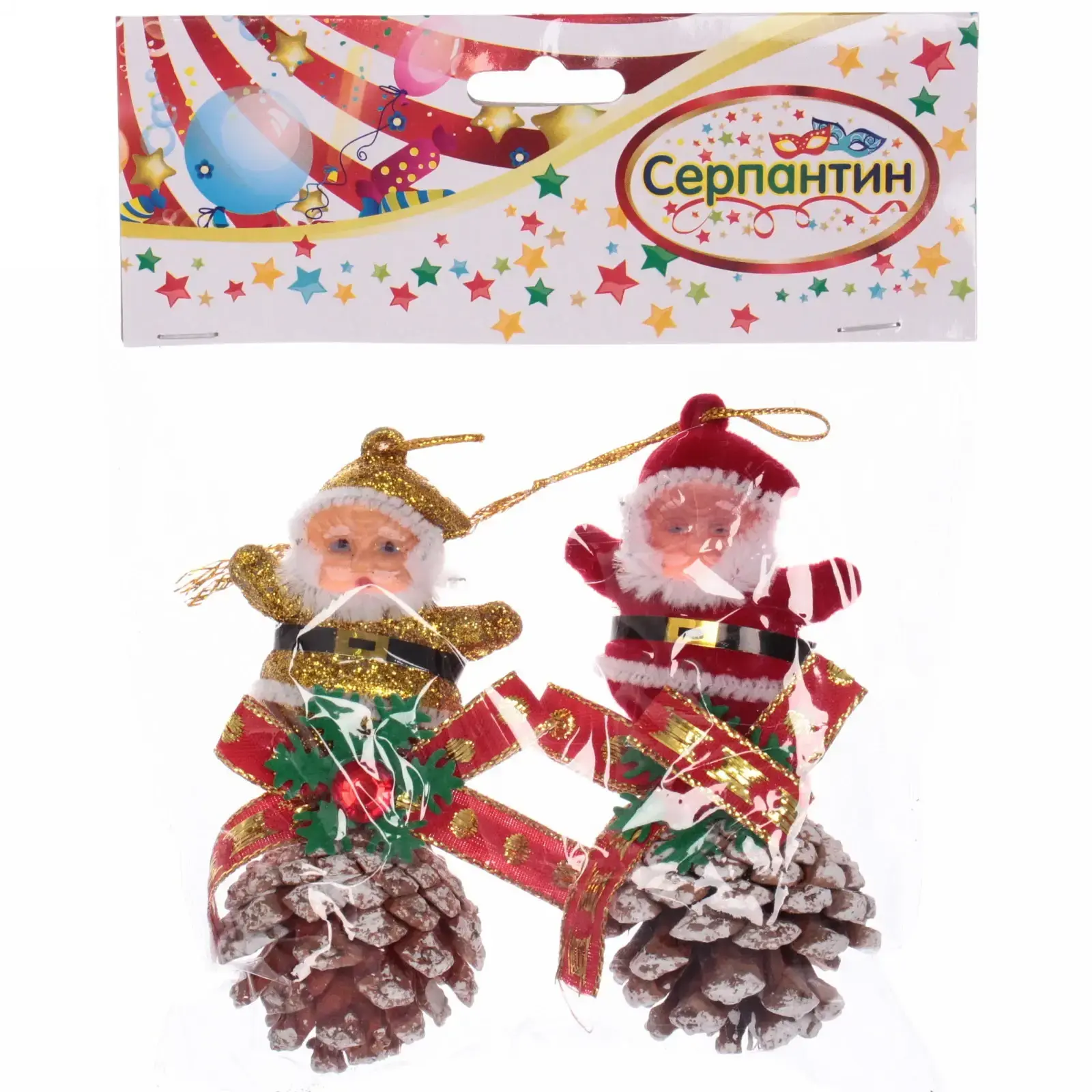 Каждое украшение представляет собой конусовидную шишку из пластика с текстурой натурального дерева. Фигурки Деда Мороза закреплены на декоративных лентах с элементами ручной росписи. В комплекте: 1 украшение с красным Санта-Клаусом и золотистыми акцентами, 1 — с золотым костюмом и зелеными декоративными вставками.