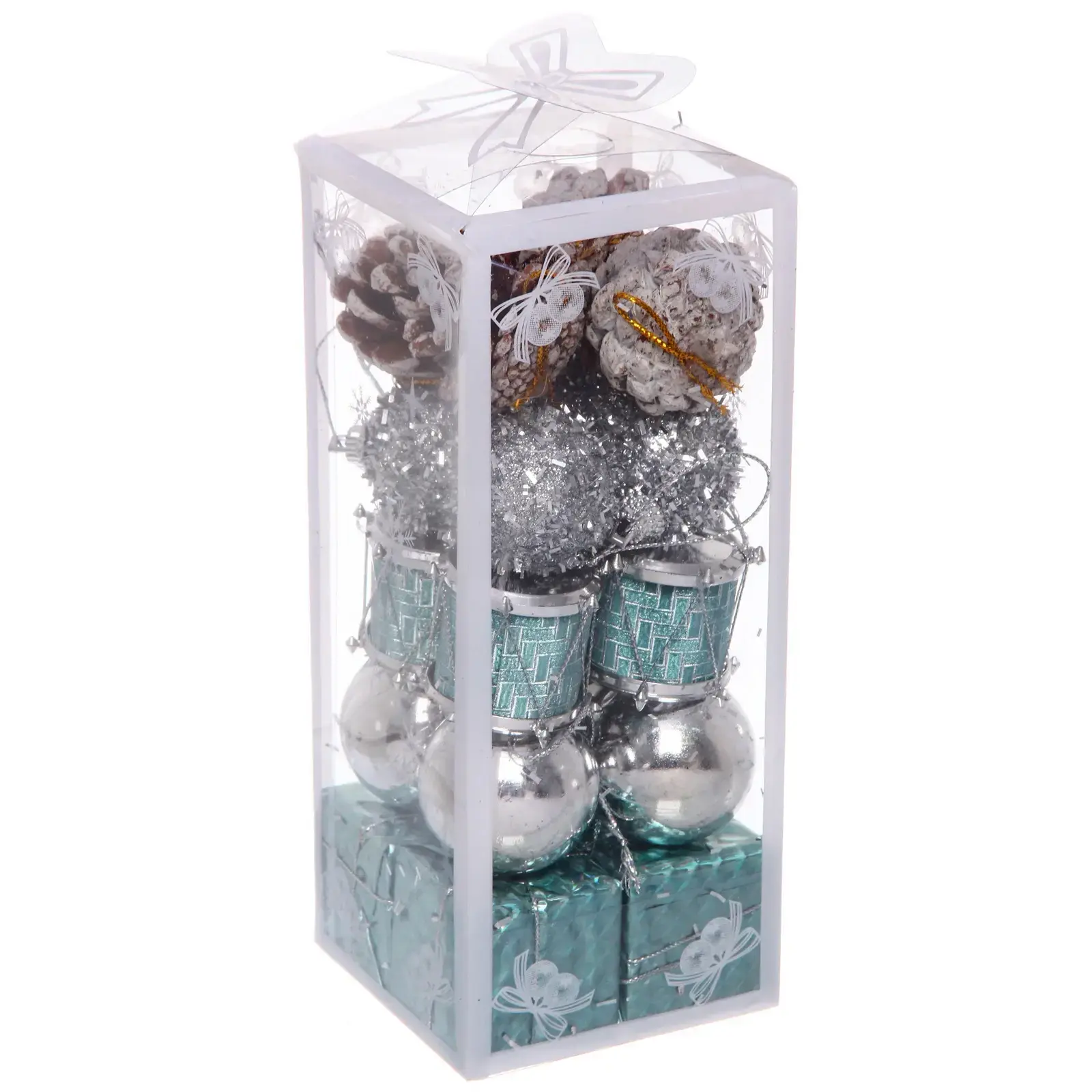 Все элементы изготовлены из качественных материалов (пластик, пенопласт) и помещены в удобный прозрачный контейнер с крышкой. Контейнер не только защищает украшения при хранении, но и служит стильной подарочной упаковкой.