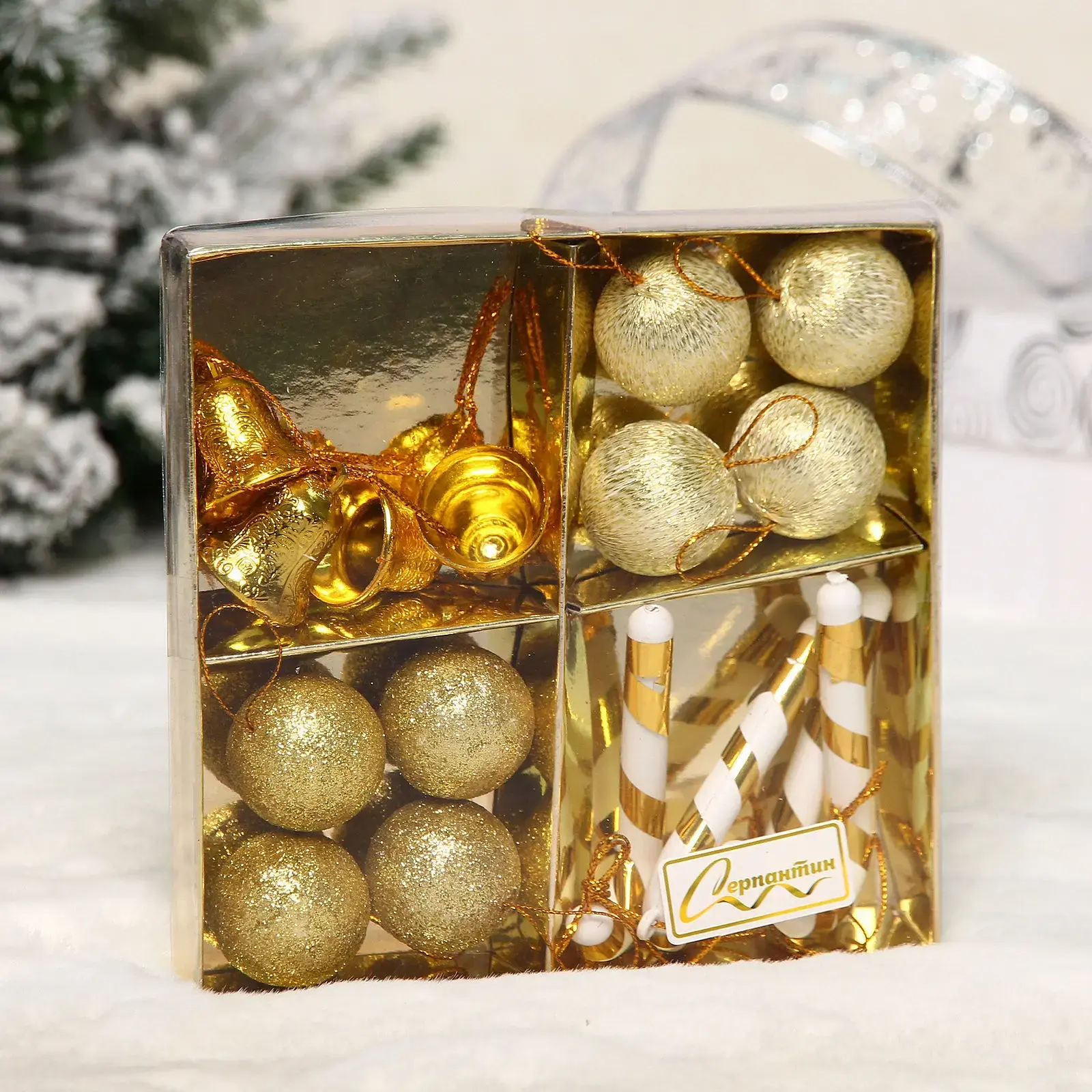 Размер коробки: 13.5х13.5 см. Высота около 10-12 см. Все элементы имеют крепления для удобного размещения на елке или в интерьере.