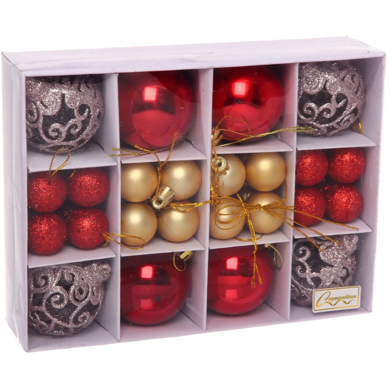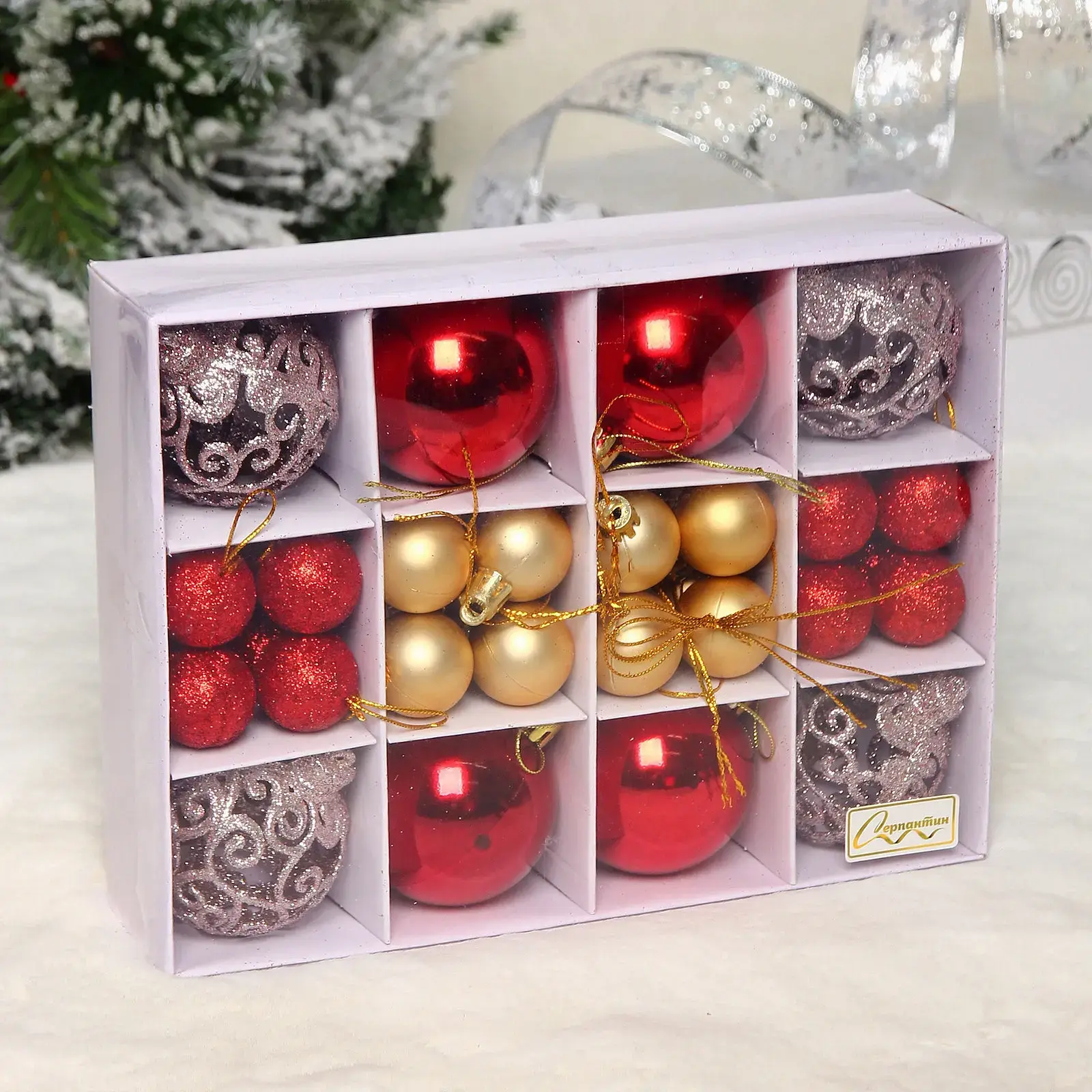 Комплект декоративных элементов для новогоднего декора объединяет изысканные оттенки золота, розового золота и классического красного. Упаковка-коробка с продуманной организацией хранения станет практичным решением для ваших праздничных аксессуаров.
