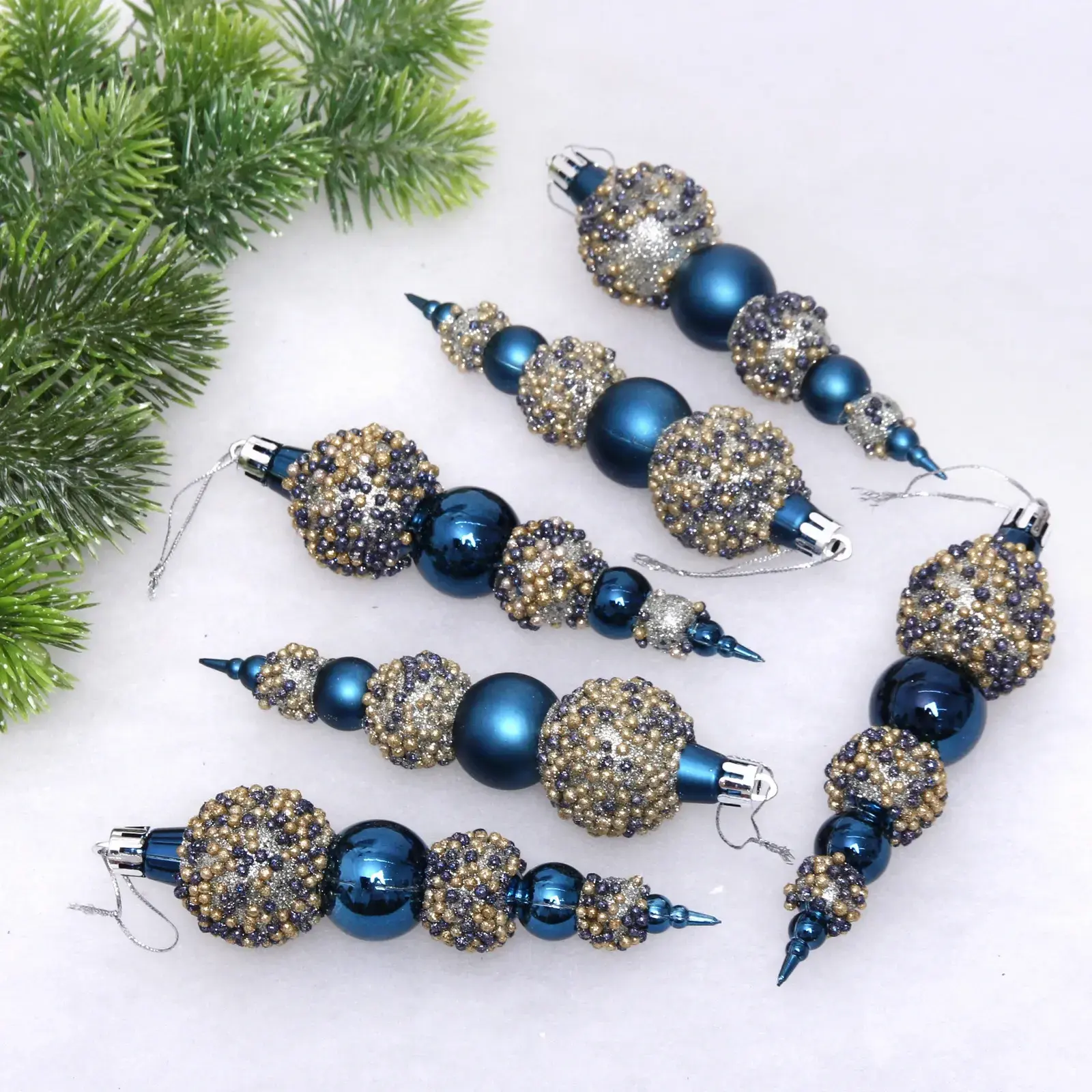 Набор состоит из шести уникальных украшений, которые идеально подойдут для декорирования новогодней елки. Благодаря разнообразным формам — от круглых до острых — вы сможете создать гармоничное и стильное оформление. Эти украшения подходят как для домашних праздников, так и для оформления общественных мест, создавая атмосферу уюта и волшебства.