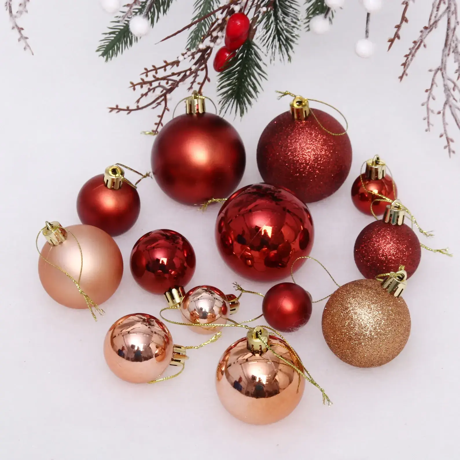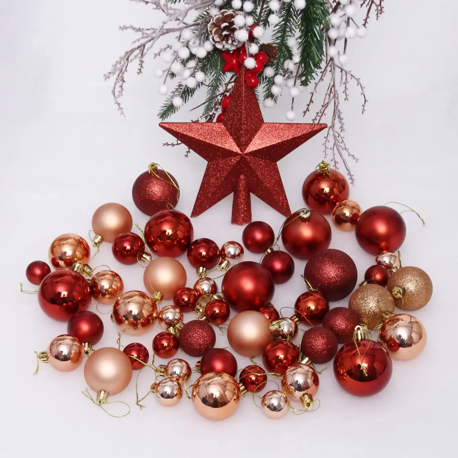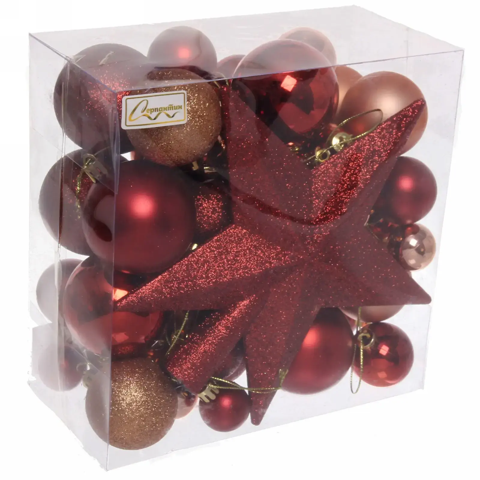 В наборе вы найдете 51 украшение, включая шары разных размеров и блестящую звезду. Цветовая палитра включает красный, золотистый и бронзовый оттенки, что позволяет создать гармоничное сочетание. Размеры шаров варьируются, что добавляет интереса к декору. Набор упакован в прозрачную коробку, что позволяет легко хранить и демонстрировать украшения.