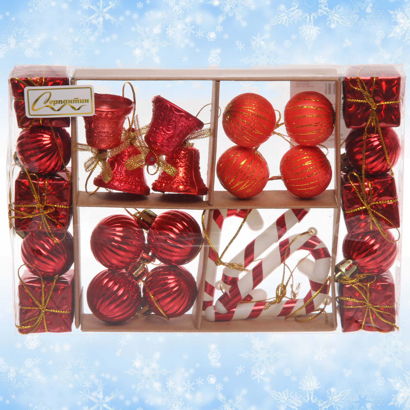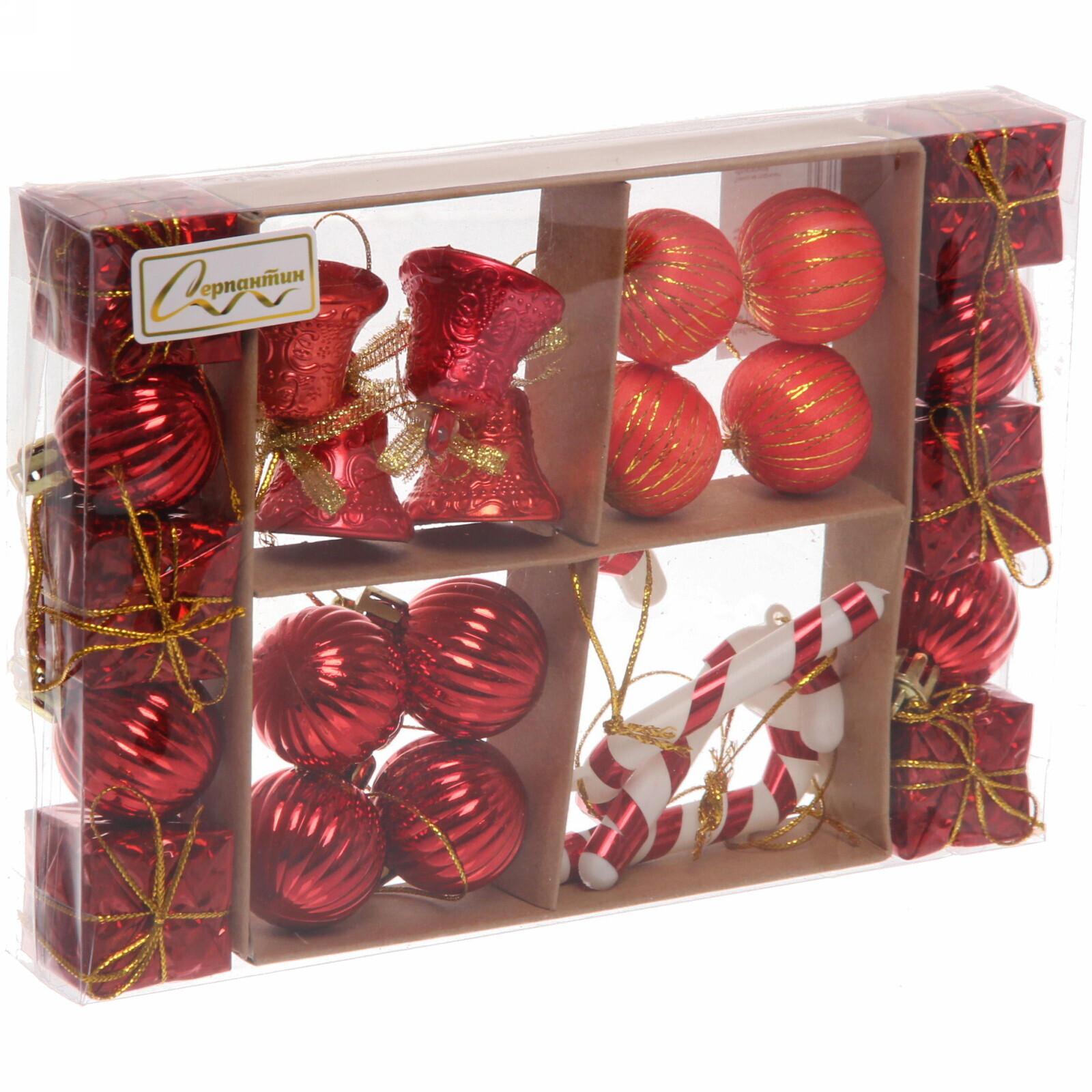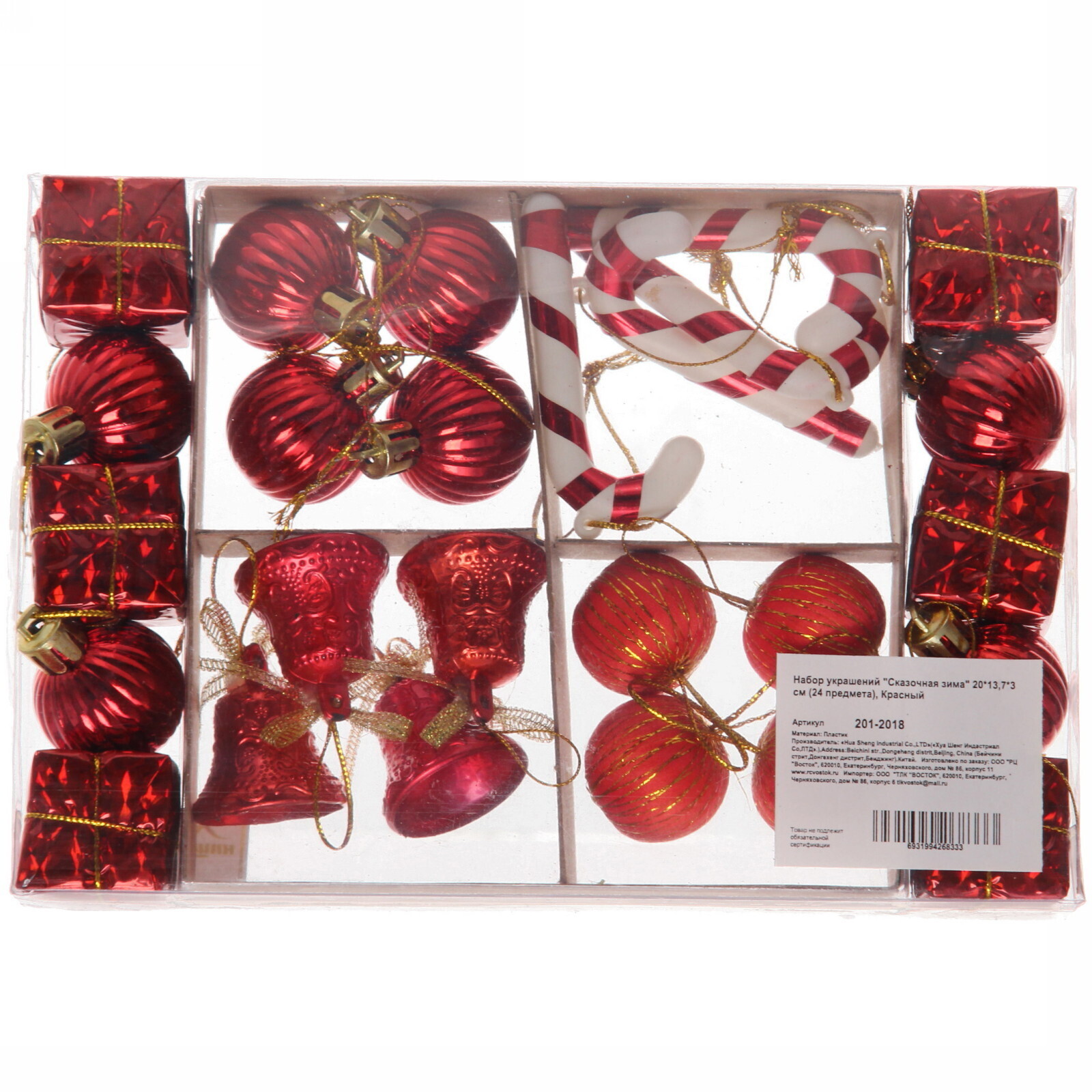 Набор включает 24 предмета, среди которых красные шары, колокольчики, подарочные коробочки и леденцы. Все элементы упакованы в прозрачную коробку, что позволяет легко выбрать нужные украшения. Он идеально подходит для украшения елки, а также для декорирования вашего дома в новогодние праздники.