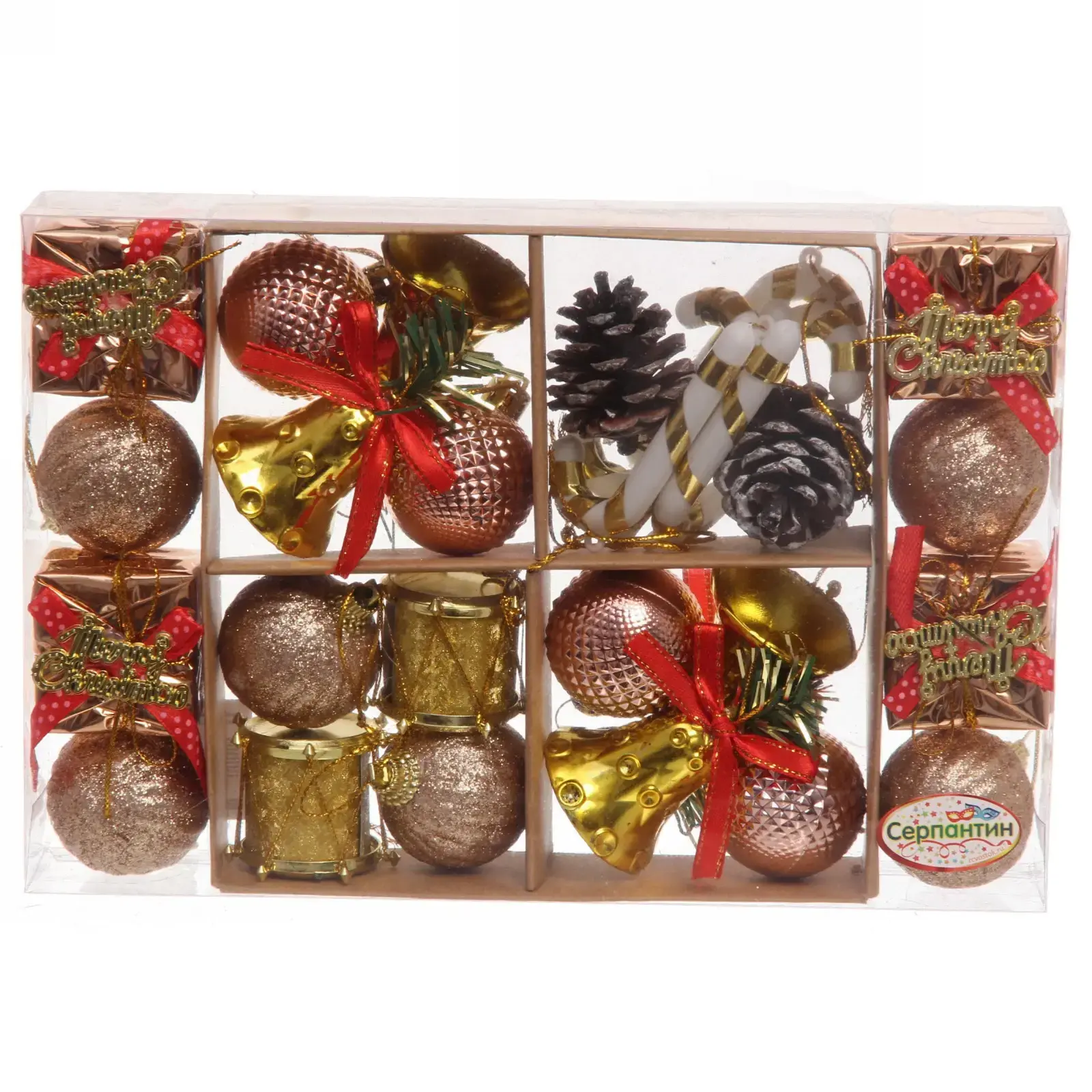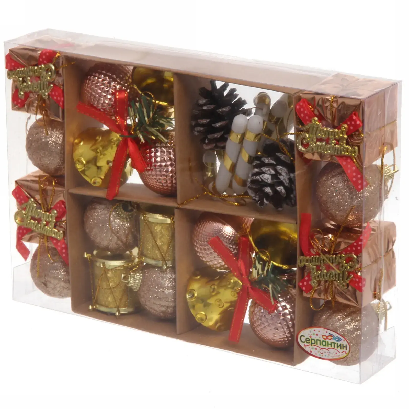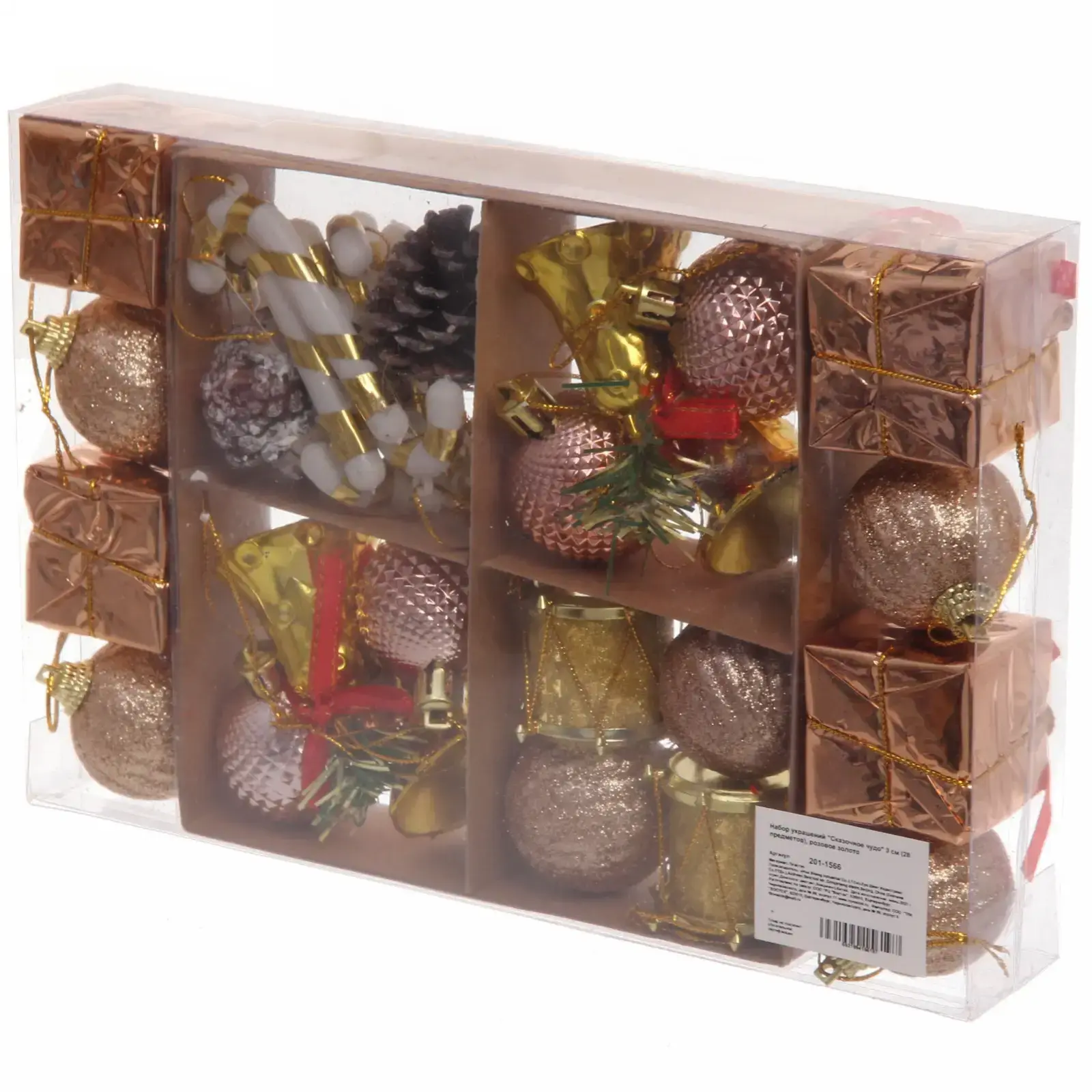 В набор входят шары различных форм и размеров, подарочные коробки, шишки и конфеты, что позволяет вам проявить креативность в оформлении. Размеры каждого элемента идеально подходят для украшения ёлки, а разнообразие форм и цветов позволит вам создать гармоничное сочетание. Набор станет отличным выбором для тех, кто ценит стиль и качество в новогоднем декоре.
