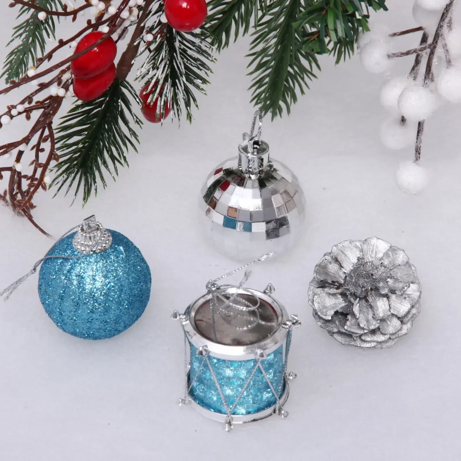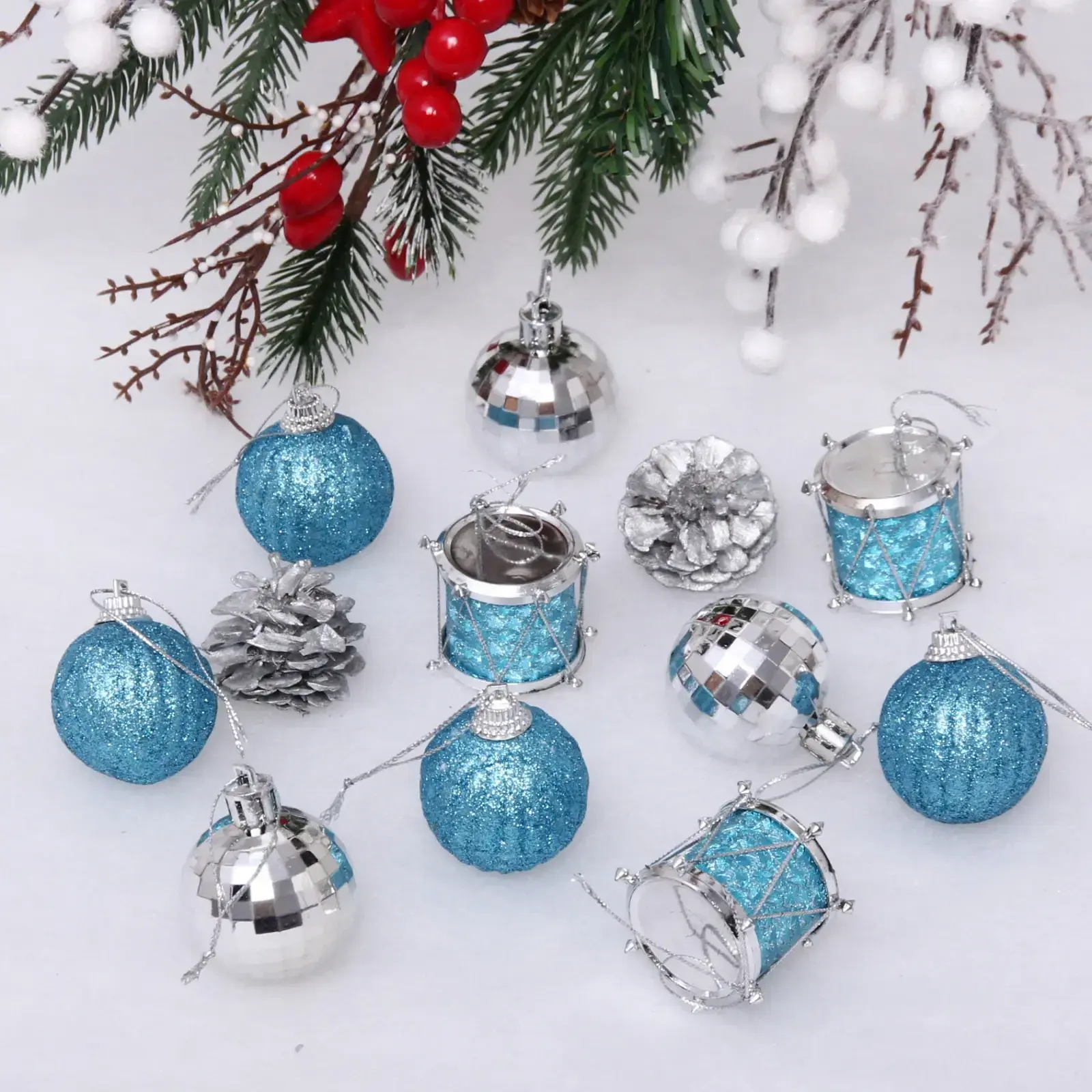 Набор состоит из 12 предметов, включая блестящие шары, миниатюрные барабаны и шишки, которые идеально подойдут для украшения новогодней елки или праздничного интерьера. Благодаря разнообразию форм и цветов, вы сможете легко комбинировать элементы, создавая уникальные композиции. Эти украшения подходят для любого стиля оформления — от классического до современного.