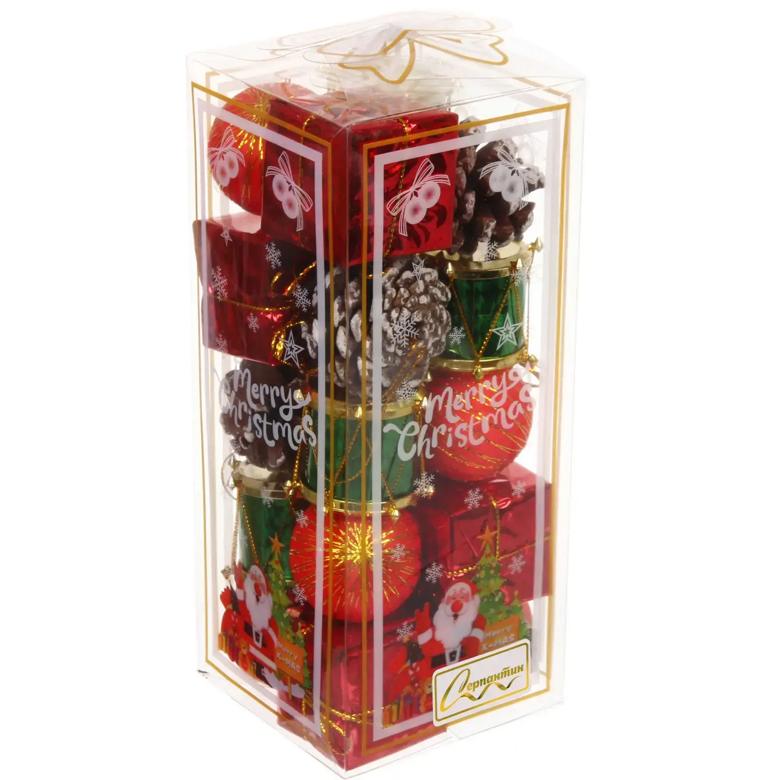 Размеры упаковки составляют 19.5х8х8 см, что делает набор компактным и удобным для хранения. Внутри вы найдете 20 различных украшений, включая элементы с надписями «Merry Christmas», что добавляет праздничного настроения. Этот набор станет отличным выбором для тех, кто хочет быстро и стильно украсить свой дом к Новому году.
