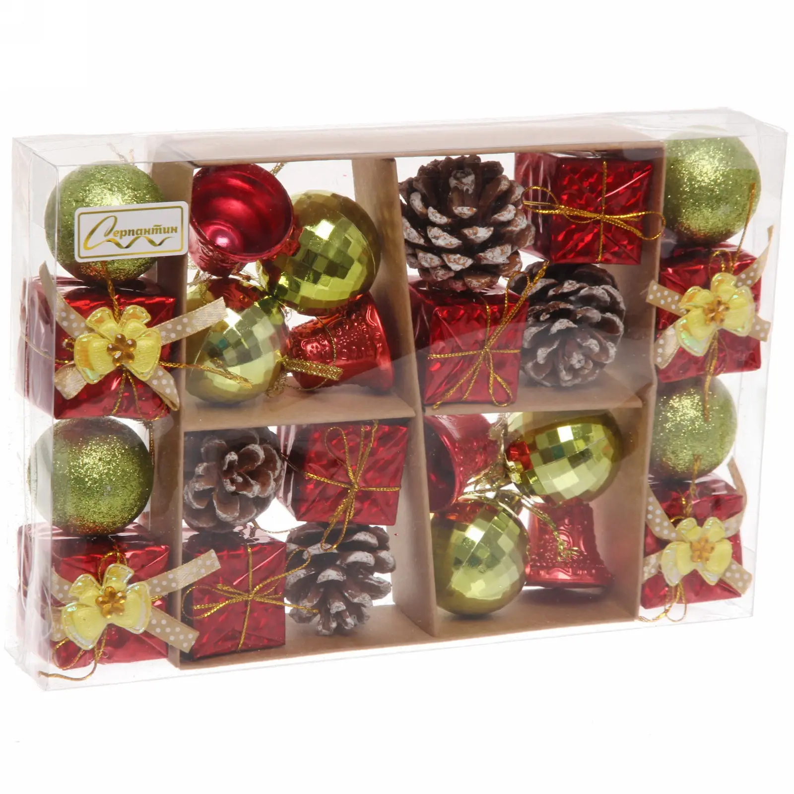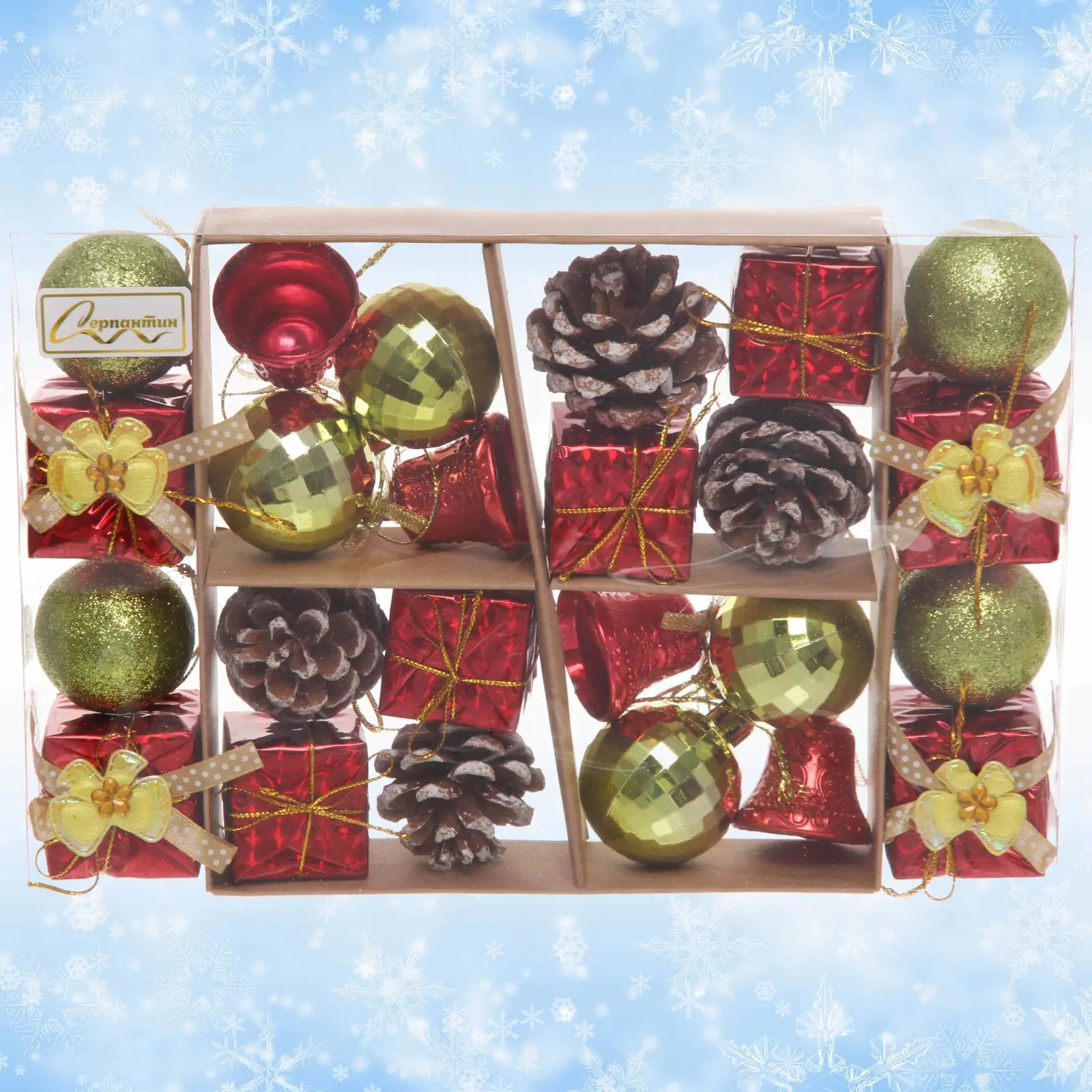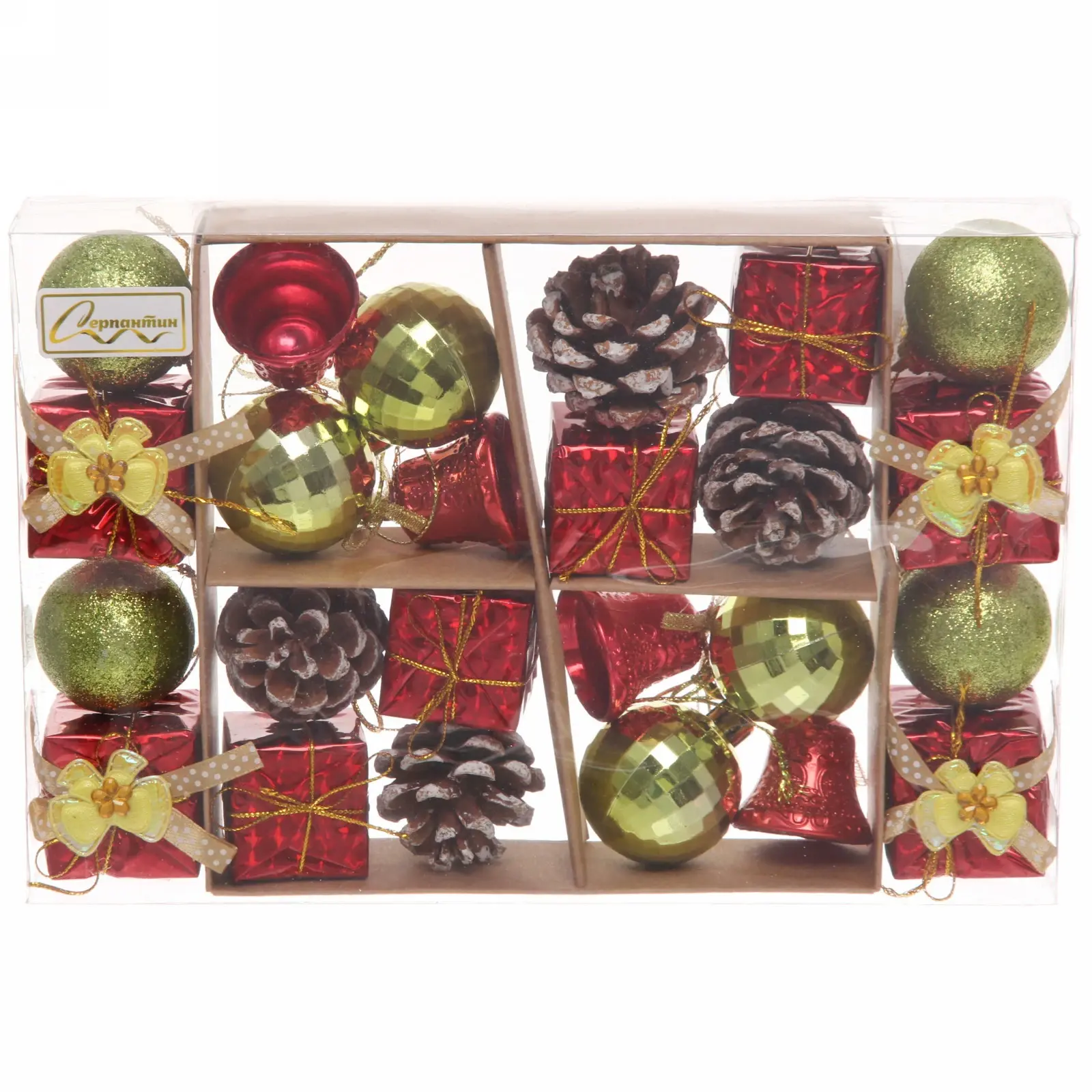 Набор украшений «Весёлое Рождество» подходит для украшения елки, создания праздничных композиций или декорирования интерьера. В него входят шары, колокольчики, шишки и подарочные коробочки, что позволяет вам проявить креативность в оформлении. Все элементы упакованы в прозрачную коробку, что делает их удобными для хранения и использования.