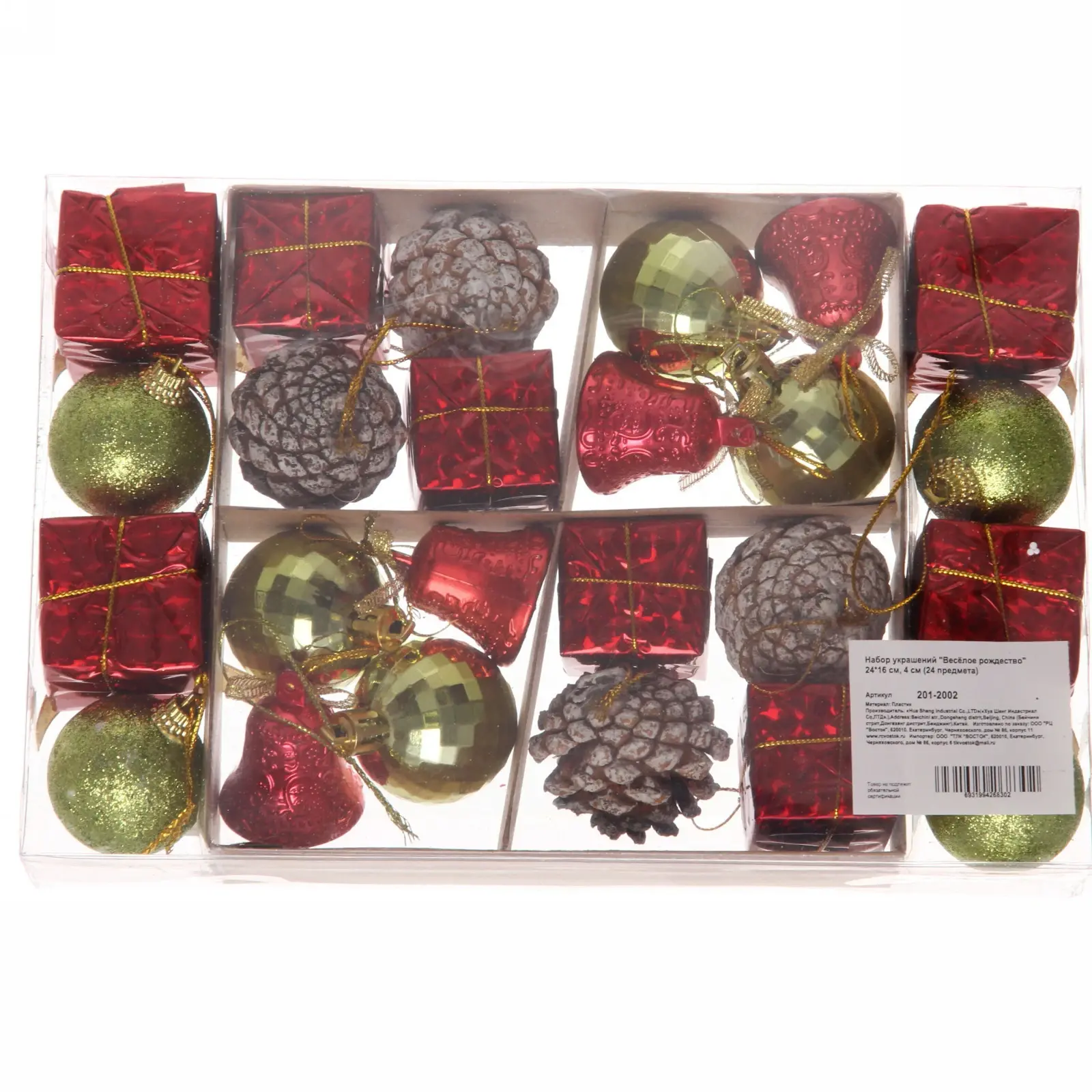 Этот набор новогодних украшений станет идеальным дополнением к вашему праздничному декору. Он включает в себя 24 ярких элемента, которые помогут создать волшебное настроение в вашем доме. Разнообразие форм и цветов, таких как красный, зеленый и золотой, добавит яркости и радости в ваш праздник.