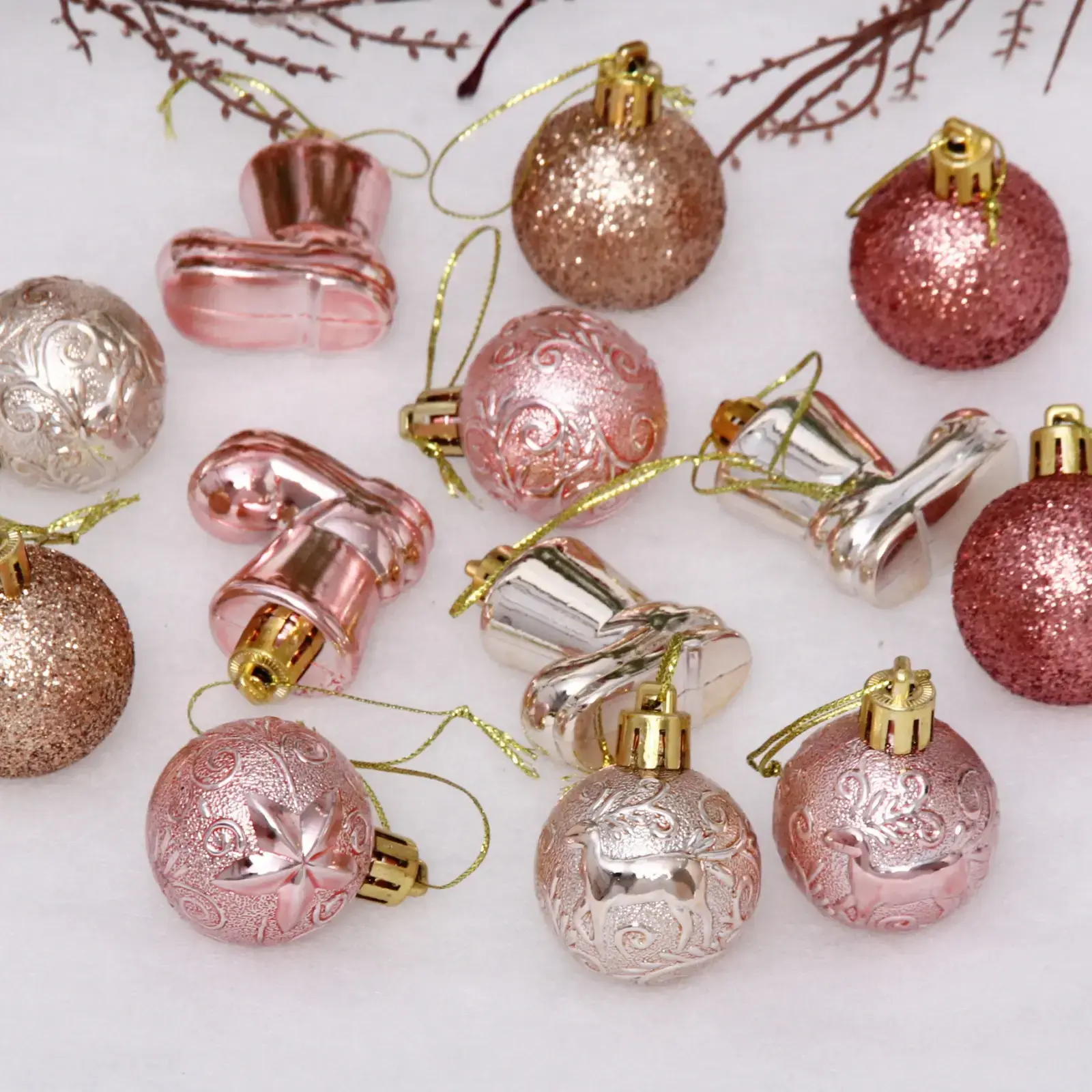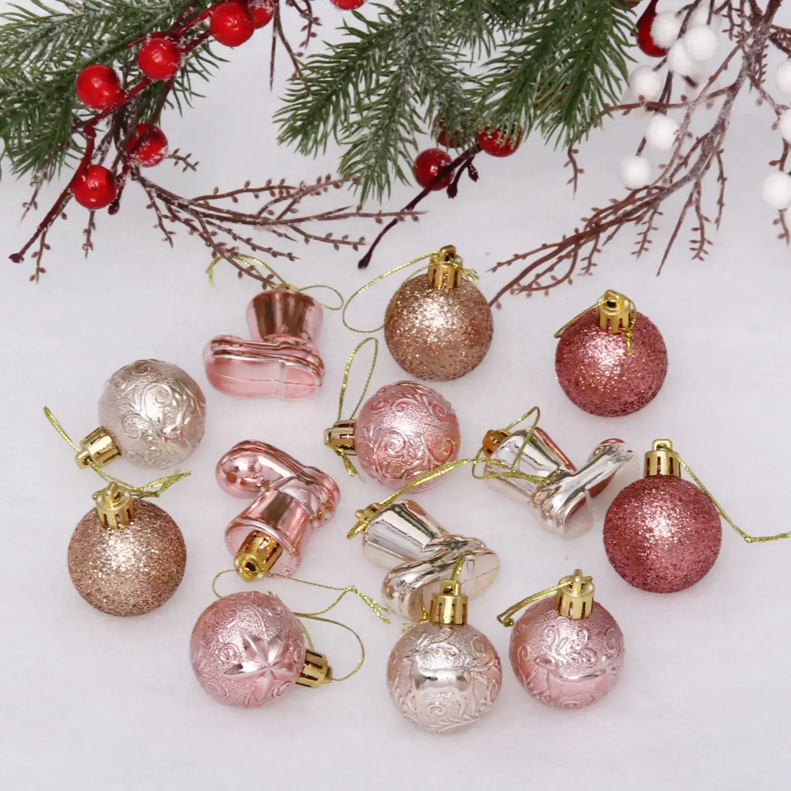 Набор состоит из 13 предметов, которые включают как круглые шары, так и фигурки, такие как сапожки и колокольчики. Эти украшения идеально подходят для декорирования рождественской елки, а также могут использоваться для создания праздничного настроения в любом уголке вашего дома. Легкие и удобные в использовании, они легко подвешиваются благодаря золотистым петлям.