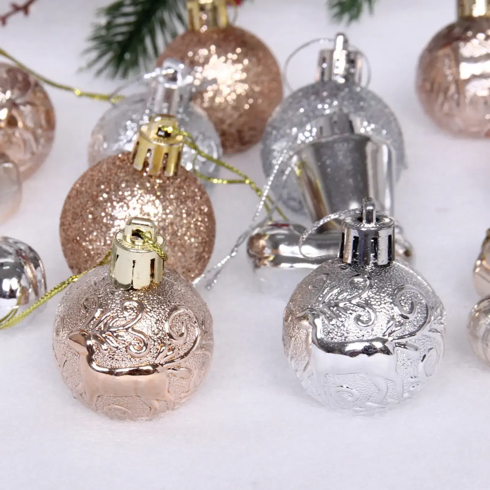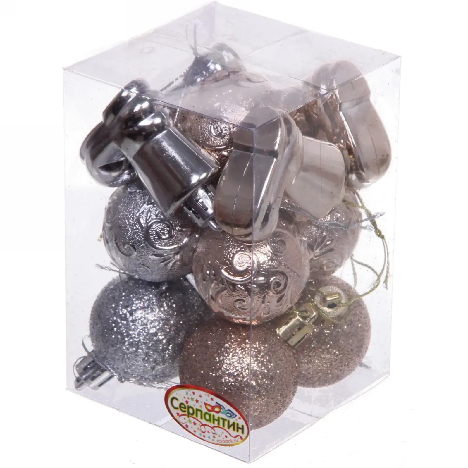 Каждый элемент набора имеет стандартный размер 4 см, что делает их идеальными для использования на ёлке. В набор входят как шарики, так и бубенцы, что позволяет создать гармоничное сочетание. Упаковка выполнена из прозрачного материала, что позволяет увидеть содержимое и удобно хранить украшения после праздников.