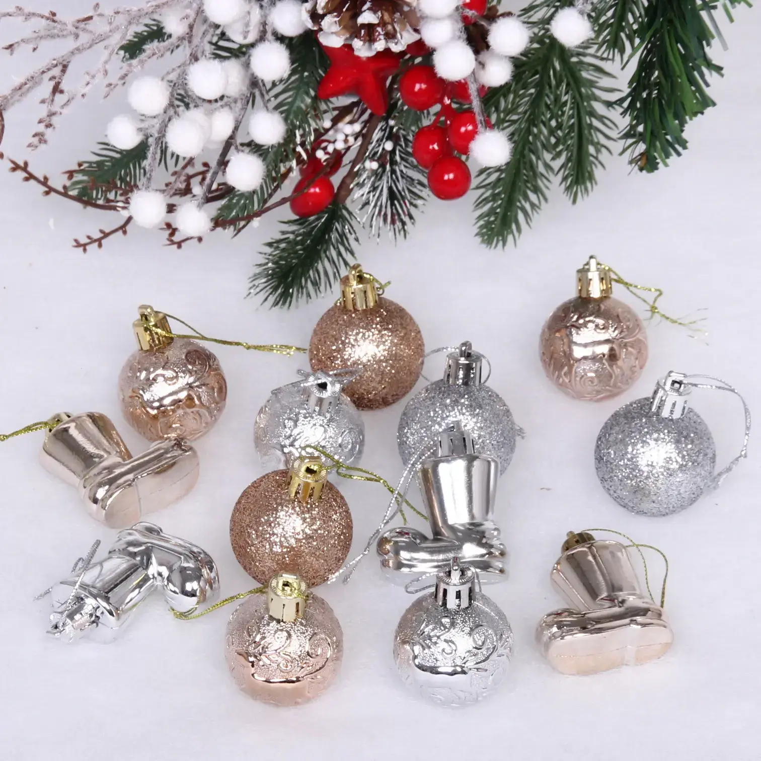 Этот набор украшений станет идеальным дополнением для вашего новогоднего декора. Он включает 13 предметов, выполненных в элегантных цветах серебра и шампани, что придаст вашему интерьеру особый шарм и уют. Украшения идеально подходят для оформления новогодней ёлки, праздничных мероприятий или создания атмосферного декора в вашем доме.
