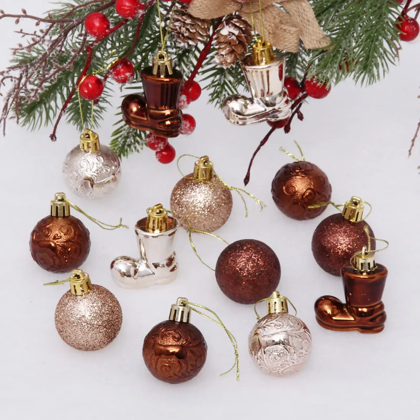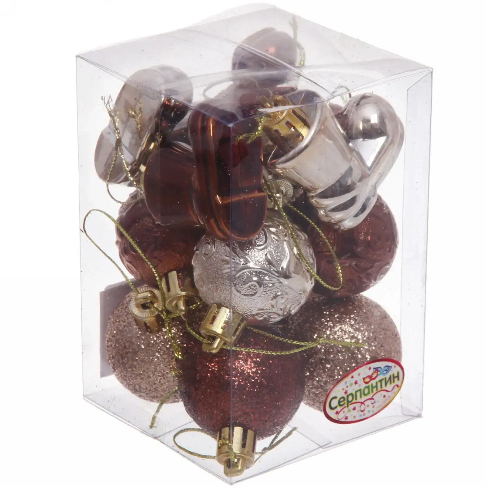 Набор состоит из 13 элементов, включая 6 шаров и 6 фигурок в виде ботинок, а также один дополнительный элемент. Эти украшения идеально подходят для декорирования новогодней елки, а также могут использоваться для создания праздничных композиций в вашем доме. Легкие и удобные в использовании, они легко подвешиваются благодаря золотистым держателям.