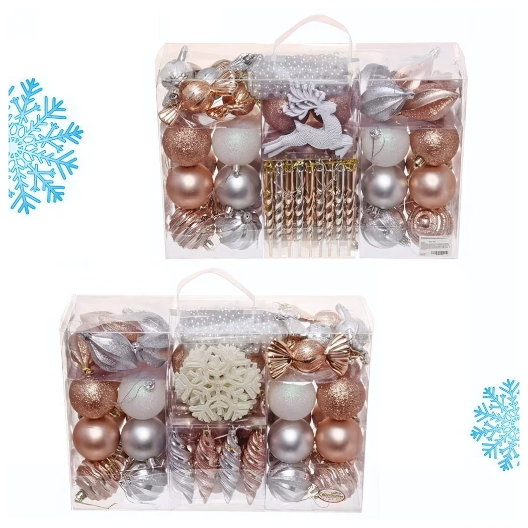 В комплекте представлены разнообразные формы и украшения: классические шары, нарядные снежинки, фигурки оленей, декоративные конфеты и другие элементы, которые легко комбинировать между собой, создавая уникальный стиль для вашей елки.
