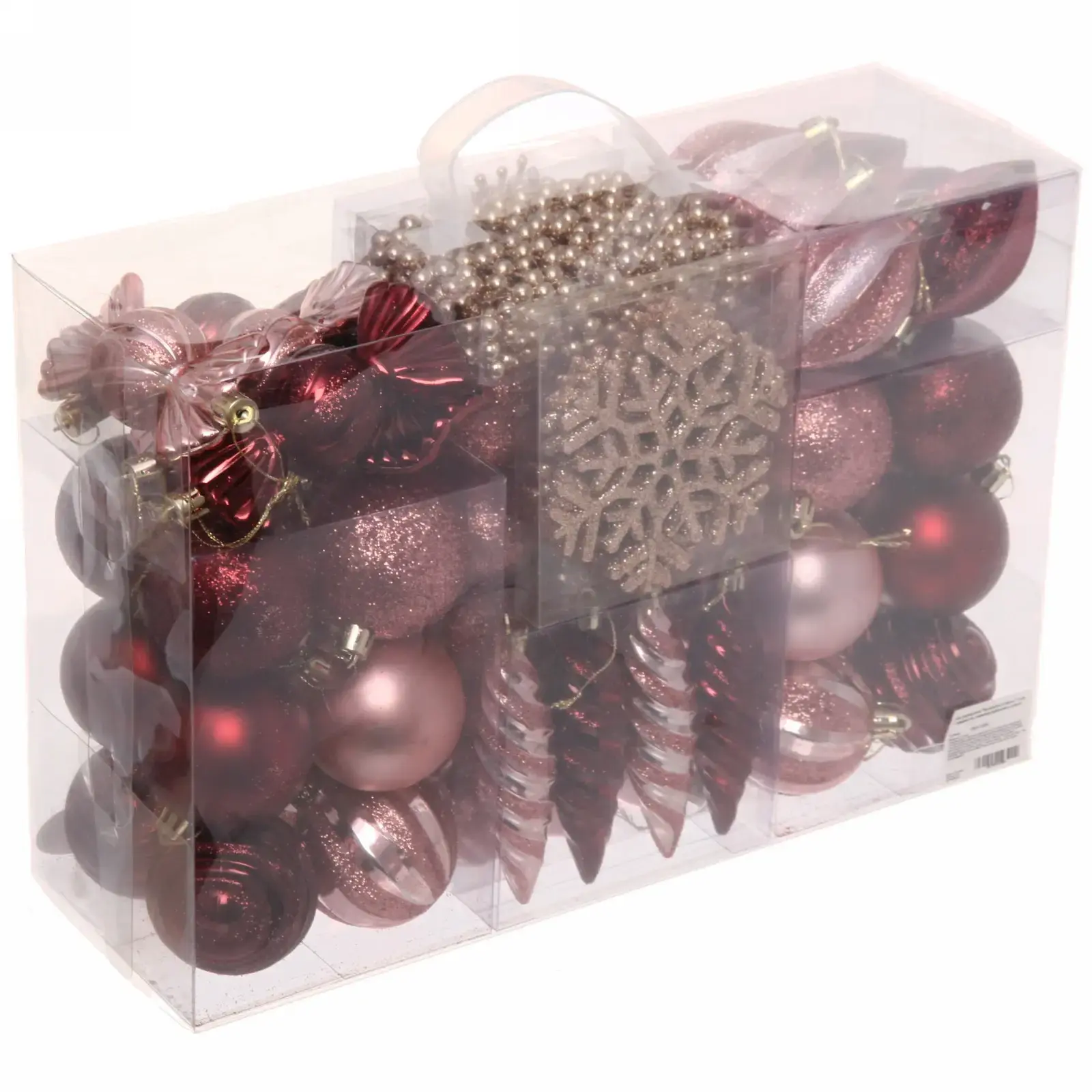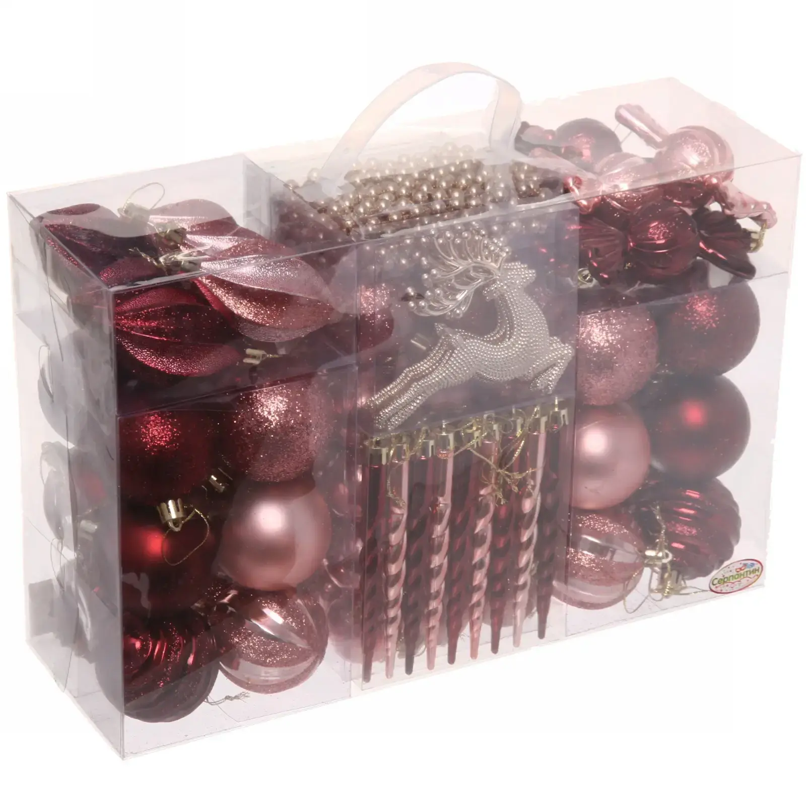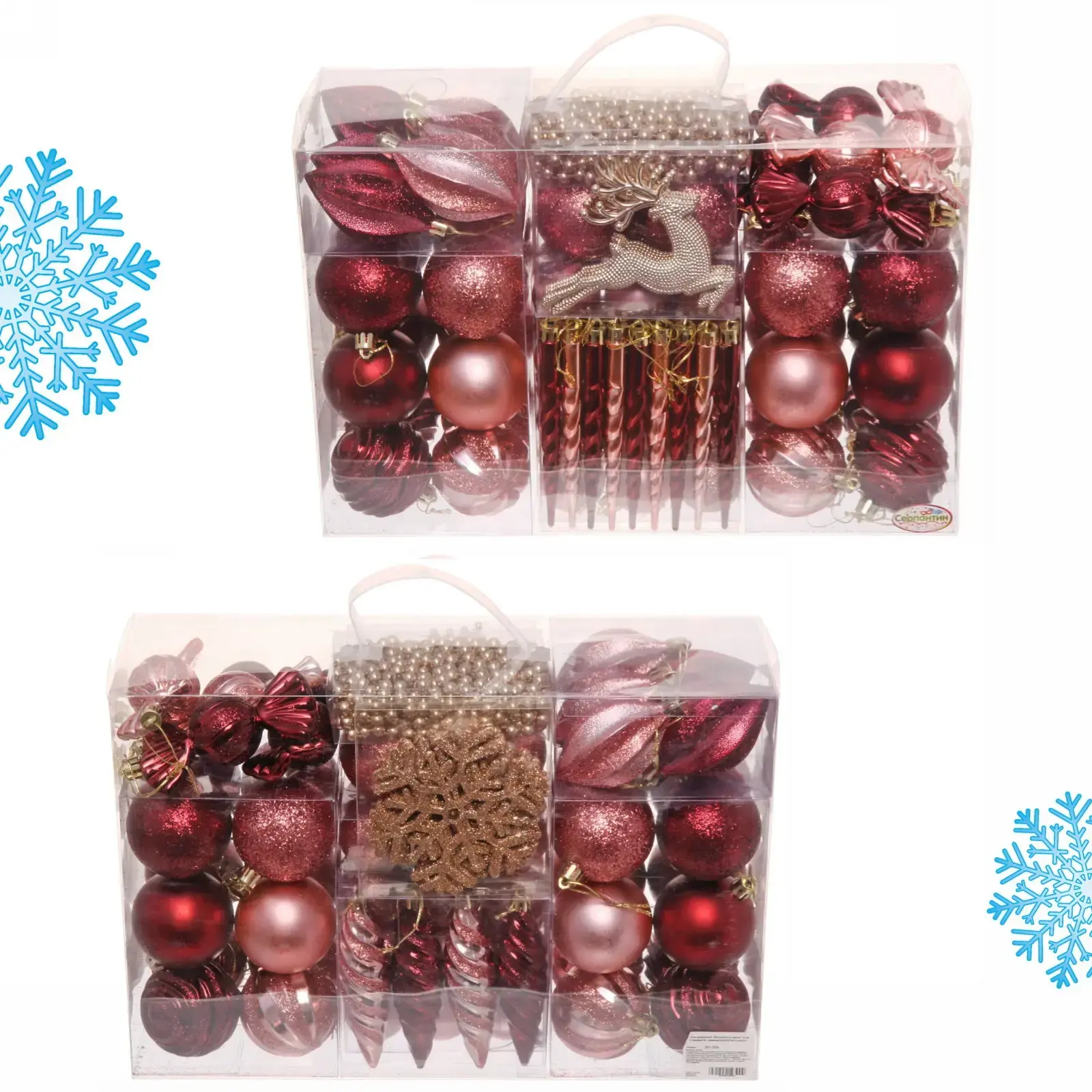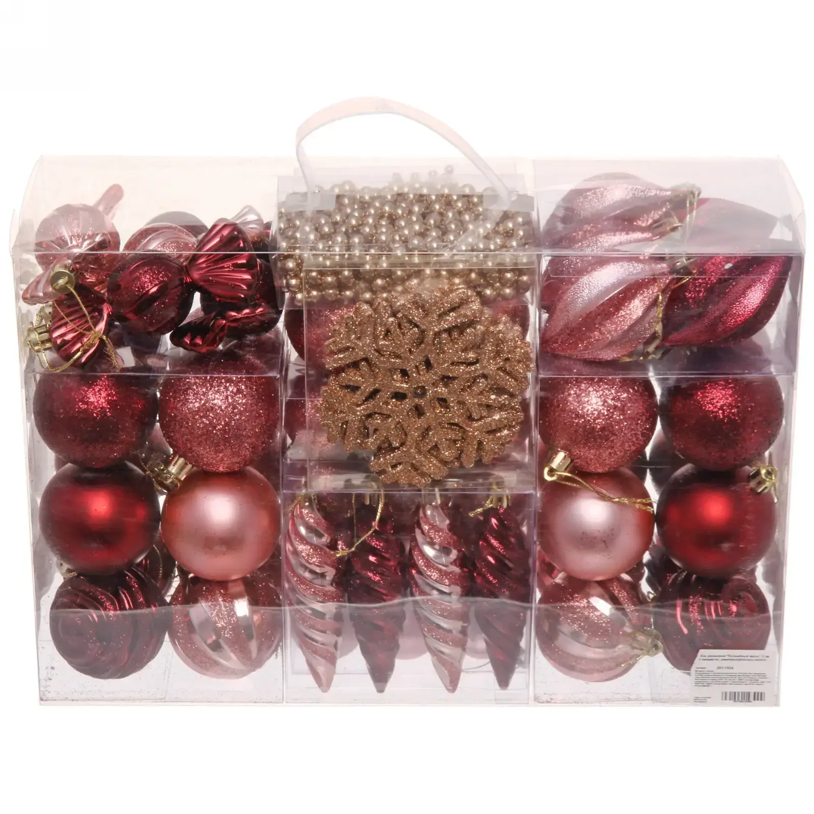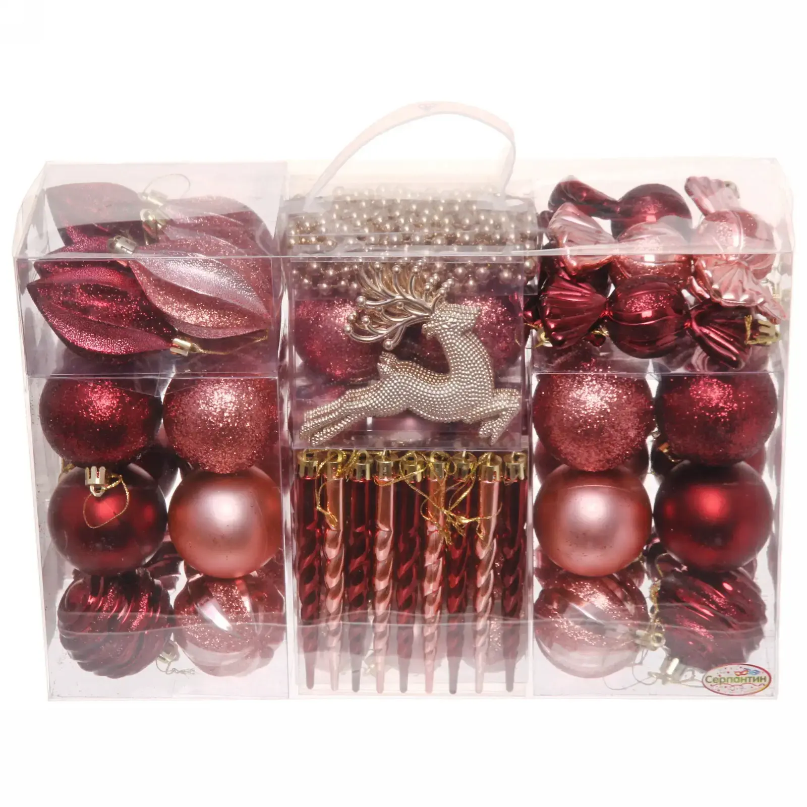 Удобная прозрачная упаковка с секциями позволяет легко хранить и переносить украшения. Все элементы выполнены из качественного пластика, устойчивого к повреждениям. Богатая цветовая палитра (шампань, рубин, розовое золото) создает роскошный праздничный ансамбль.