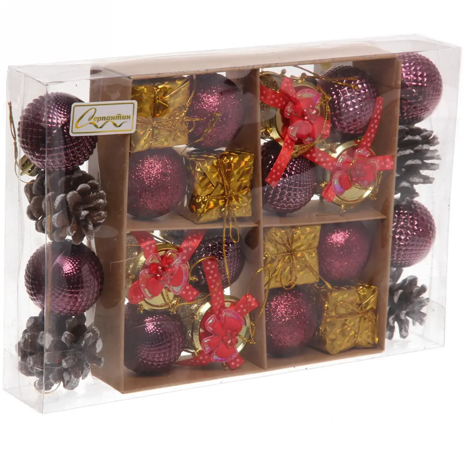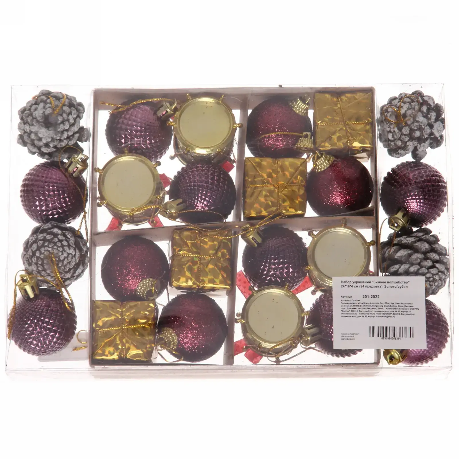 Набор украшений включает 24 предмета, которые идеально подходят для украшения новогодней елки, а также для декорирования интерьера. В него входят фиолетовые блестящие шарики, золотые коробочки с красными лентами, декоративные элементы в виде бантиков и шишек. Все элементы имеют петли для удобного подвешивания.