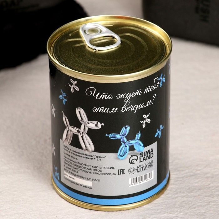Консервная банка выполнена в минималистичном стиле с яркими графическими элементами. Основной цвет — черный, а крышка — золотистая, что придает набору элегантный вид. Размеры и точные характеристики мыла и предсказаний могут варьироваться, но каждый элемент создан с любовью и вниманием к деталям.