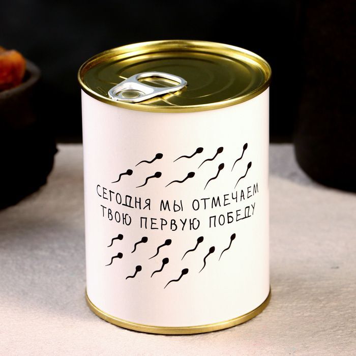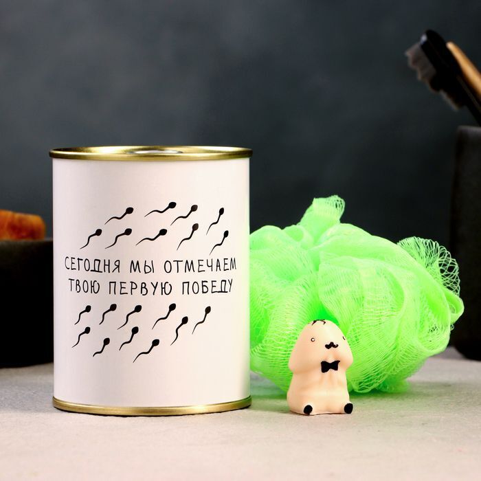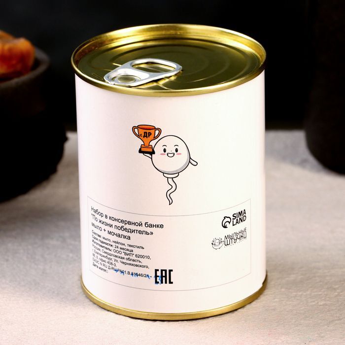 Набор представлен в белой консервной банке с золотистой крышкой, на которой размещен текст: «СЕГОДНЯ МЫ ОТМЕЧАЕМ ТВОЮ ПЕРВУЮ ПОБЕДУ». Это делает его не только функциональным, но и стильным. Размеры и объем банки стандартные для консервов, что позволяет удобно хранить набор. Не упустите возможность сделать себе или своим близким приятный сюрприз с этим набором!