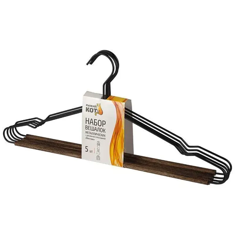 Элегантное решение для аккуратного хранения одежды — 5 металлических вешалок с деревянной перекладиной в классическом черном цвете. Идеальное сочетание прочности и винтажного шарма для повседневного использования.
