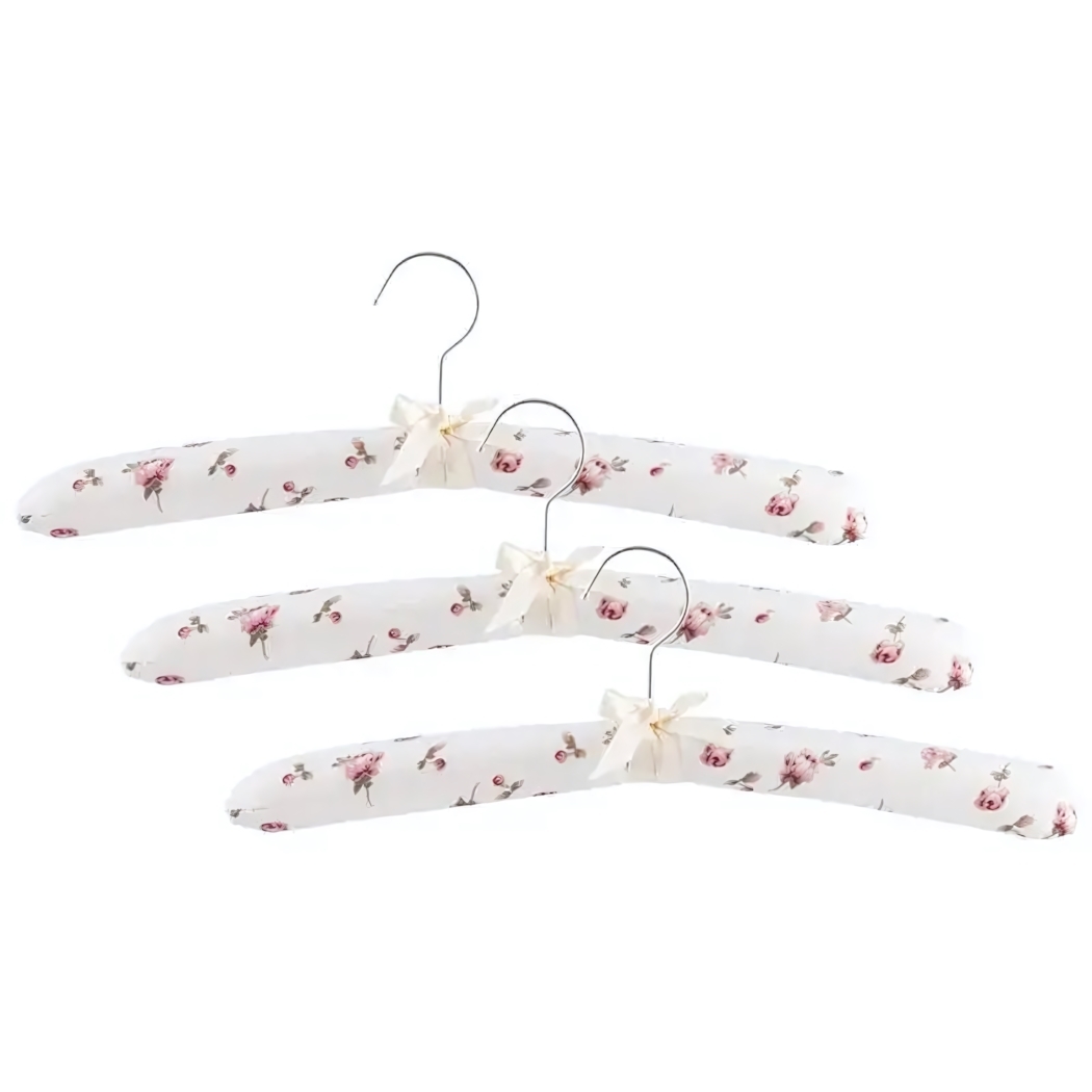 Набор из трёх вешалок с мягкой обивкой защитит ваши платья и костюмы от деформации. Цветочный дизайн и изящные бантики добавят эстетики в гардеробную.