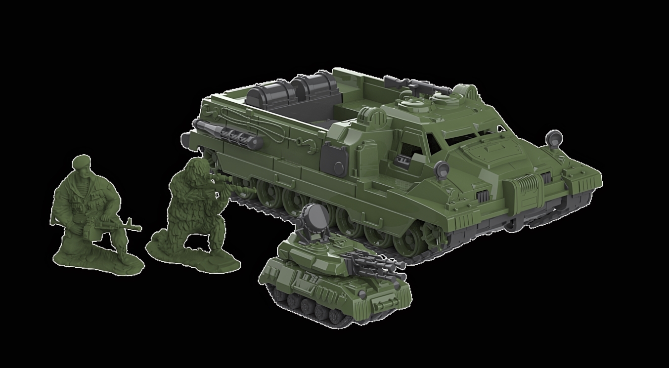- Комплект состоит из: вездеход, зенитная установка и две фигурки солдат