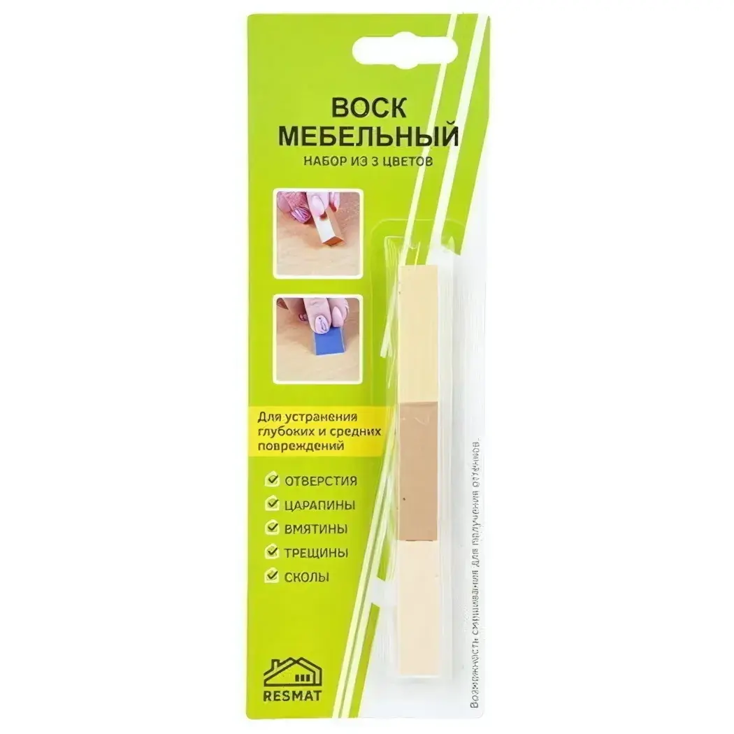 В набор входят три воска светло-бежевых оттенков, каждый размером 12х1х1 см. Упаковка выполнена из прочного пластика, что обеспечивает защиту мелков и удобство хранения. На упаковке также представлены примеры использования, что поможет вам быстро освоить процесс ремонта.
