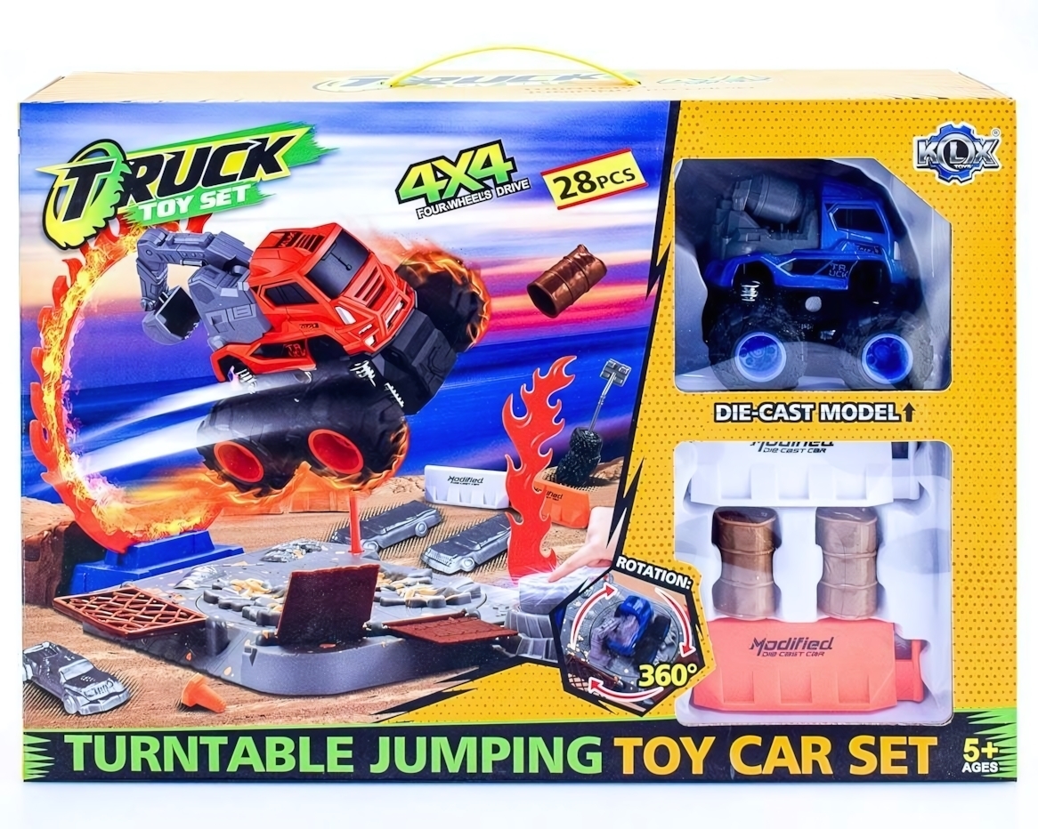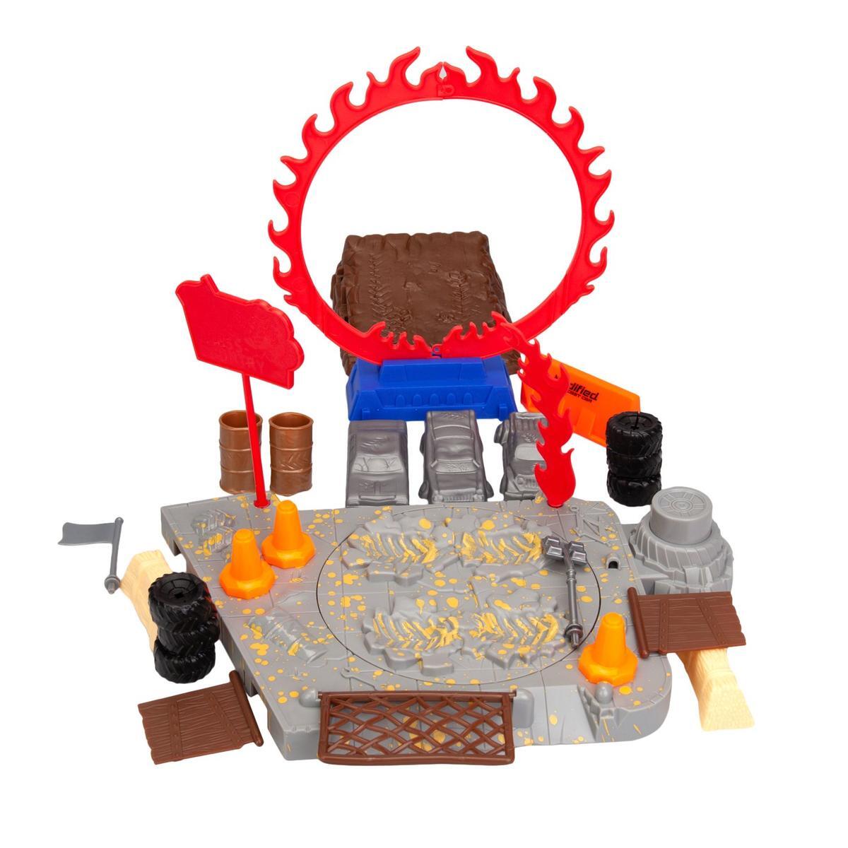 Этот комплект игрушечных машинок и трассы предназначен для детей, увлечённых гонками, прыжками и шоу с препятствиями. С ним можно создавать зрелищные трюки, выполнять прыжки через кольца, запускать машинки по трассе, а благодаря 26 аксессуарам расширить возможности игры и проявить фантазию.