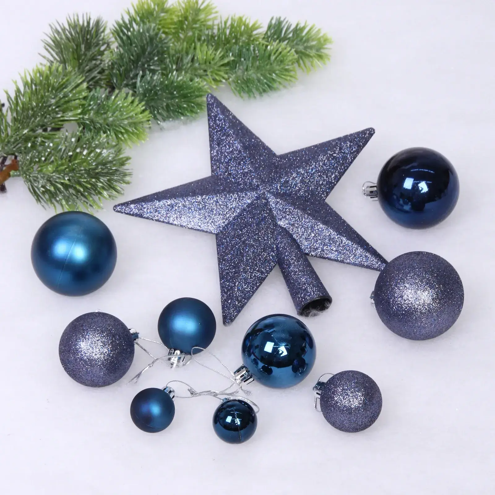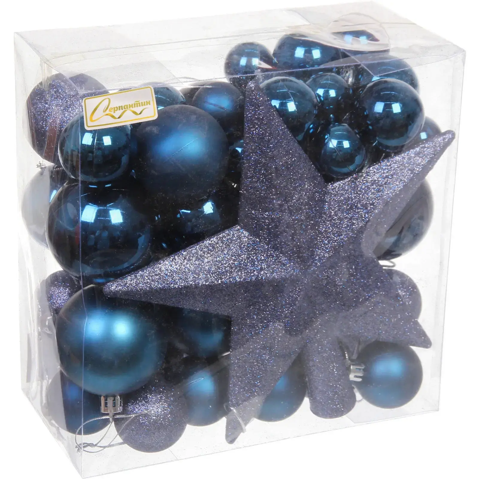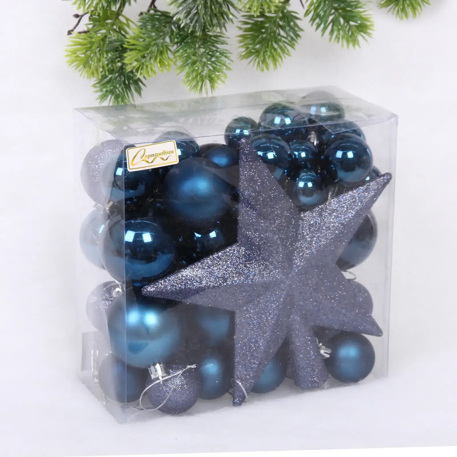 В набор входят шары разных размеров и одна звезда, что позволяет вам экспериментировать с композицией. Цветовая палитра включает темно-синие, светло-синие и серебристые оттенки, что делает набор универсальным для любого стиля интерьера. Упаковка прозрачная, что позволяет видеть содержимое и удобно хранить украшения после праздников.