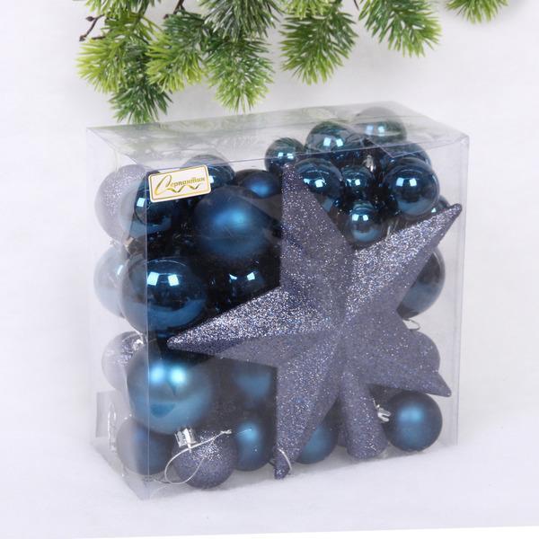 Отгружается полный набор из 52 предметов, включая шары различных размеров и одну большую декоративную звезду. Материал украшений — прочный ПВХ с качественным покрытием, устойчивым к истиранию. Цветовая палитра выдержана в одном стиле, что облегчает создание цельной композиции.