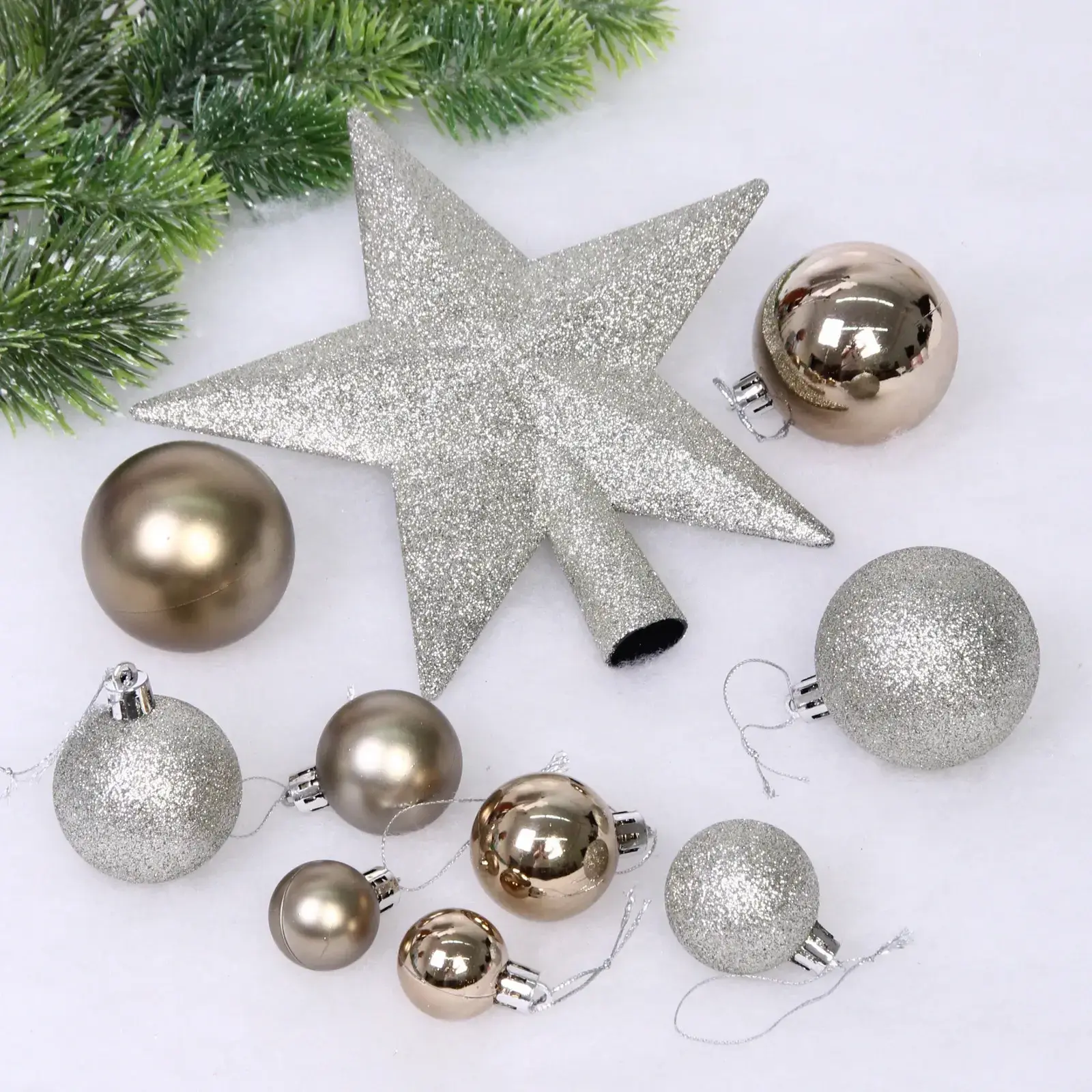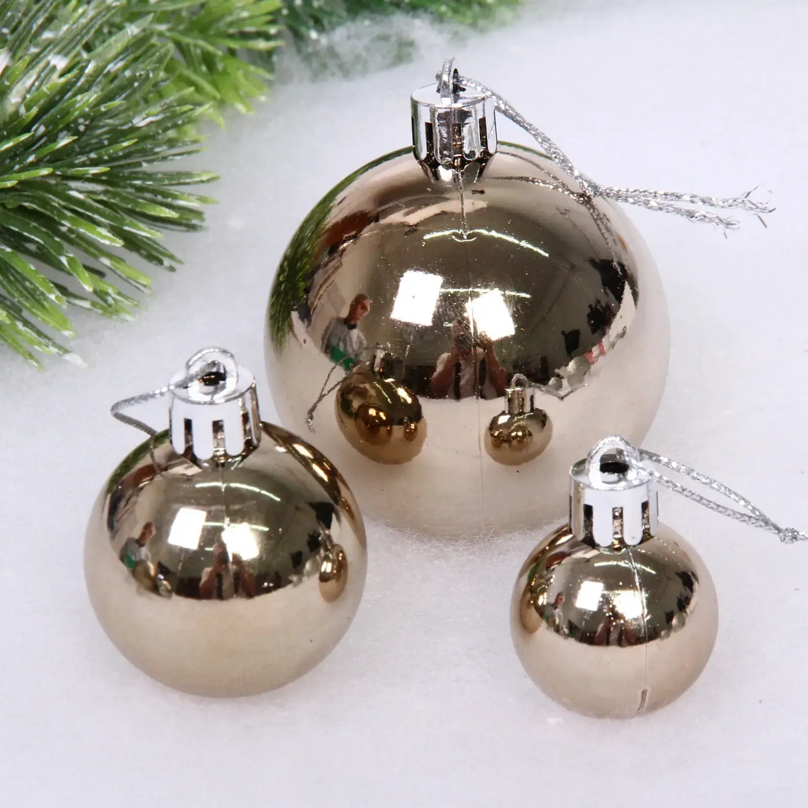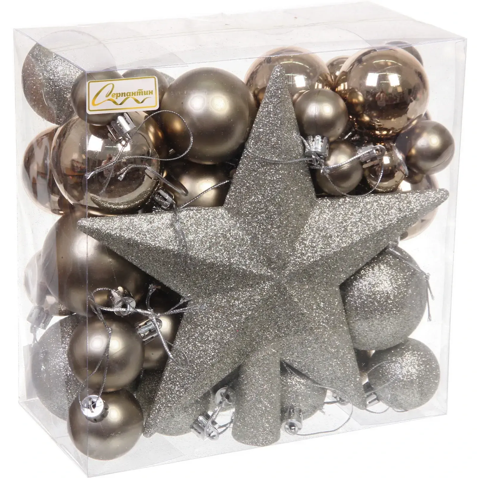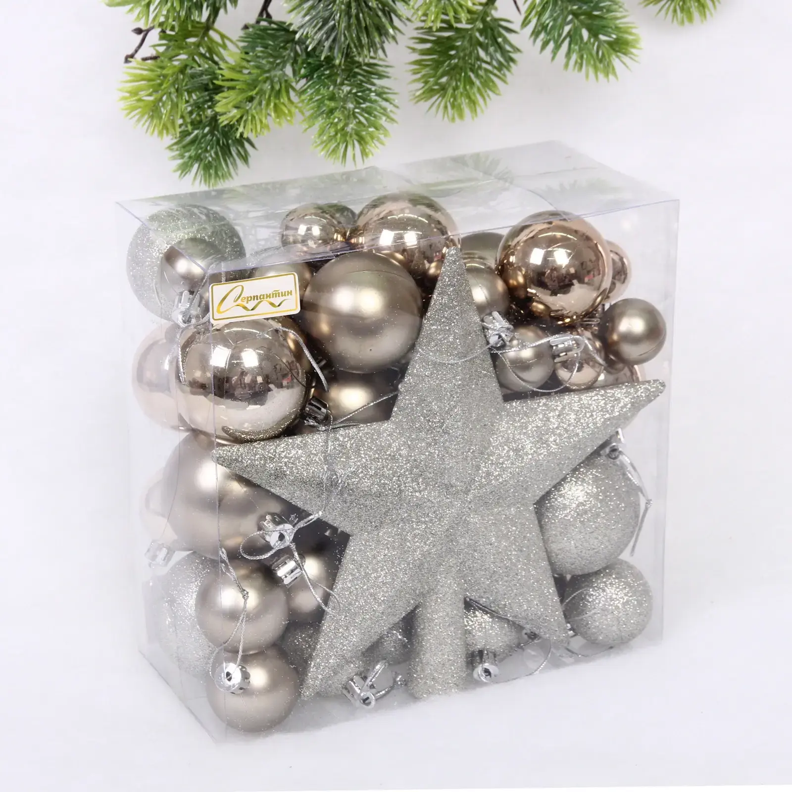 В набор входят 52 предмета, включая шарики различных размеров и одну звезду. Все украшения имеют крепления для подвешивания, что делает их удобными в использовании. Основной цвет — шампань с серебристым акцентом, что добавляет изысканности вашему новогоднему декору. Упаковка прозрачная, что позволяет видеть содержимое и удобно хранить украшения после праздников.