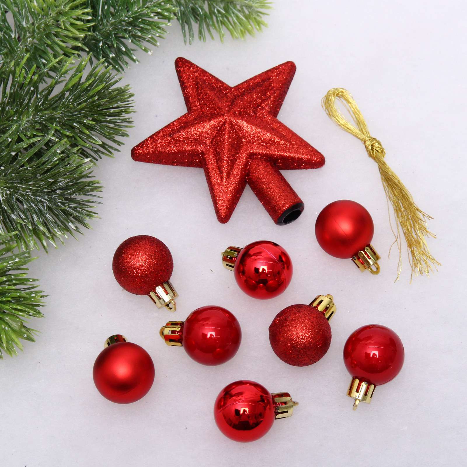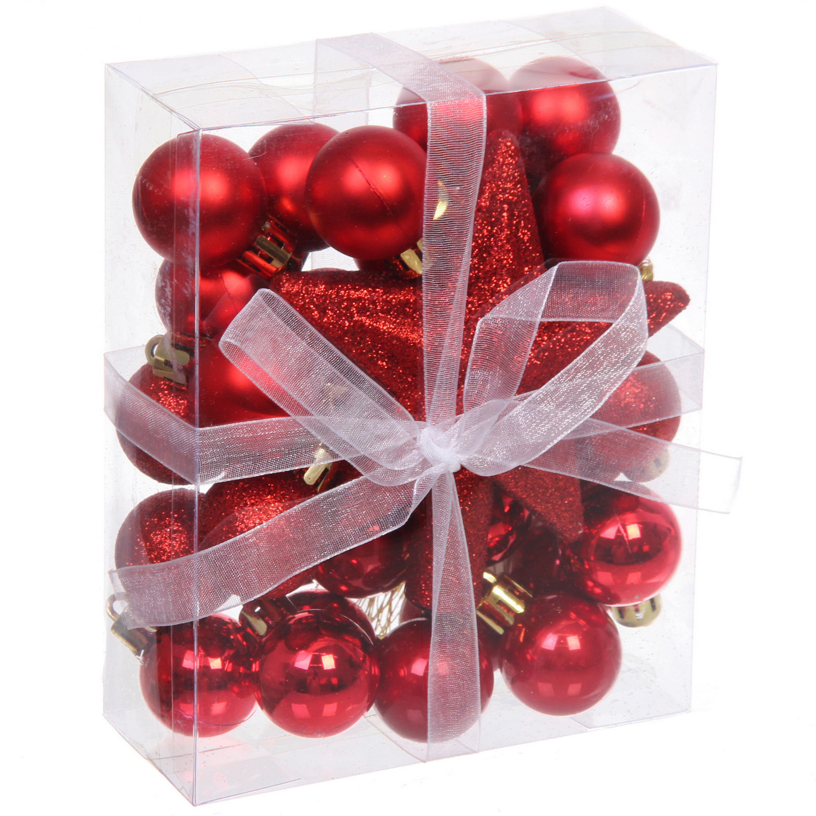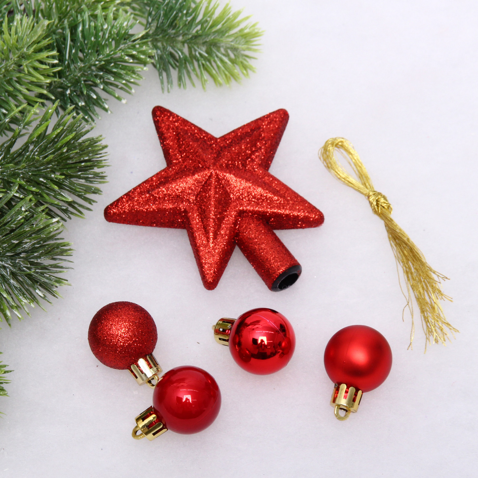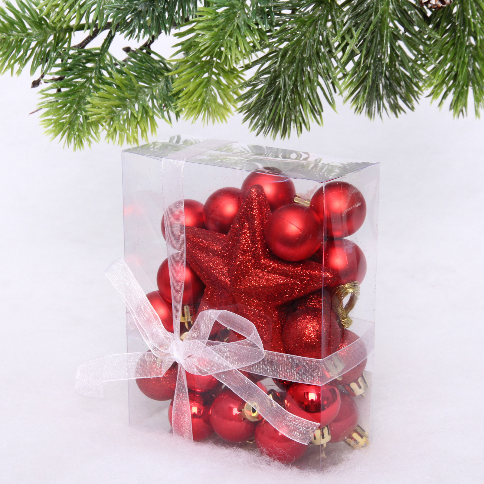 В набор входят 30 предметов, среди которых красные шарики различного диаметра и одна звезда с блестящей текстурой. Шарики имеют размеры от 4 до 10 см, что позволяет создать интересные композиции. Все элементы выполнены из качественного пластика, что обеспечивает их долговечность и безопасность. Упаковка украшена белым бантом из органзы, что делает набор ещё более привлекательным для подарка.