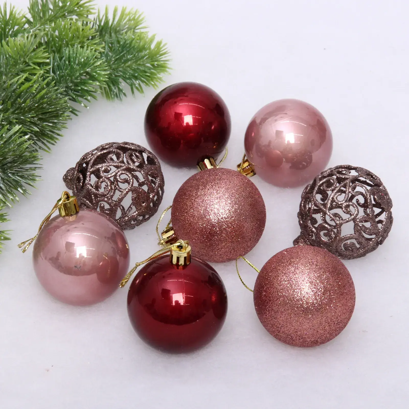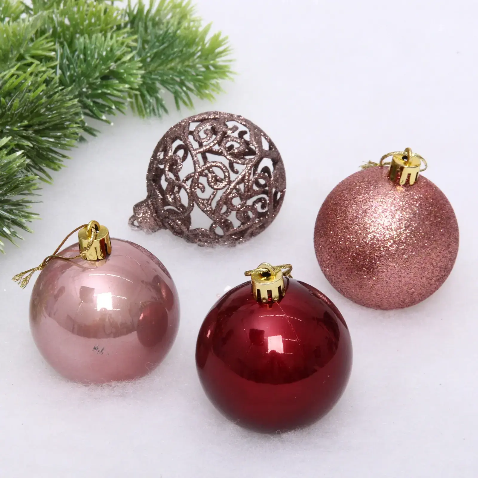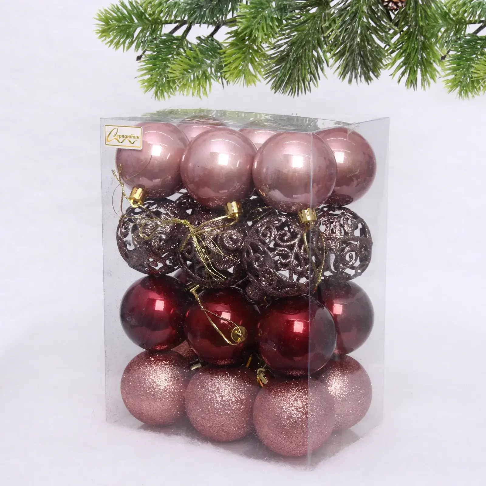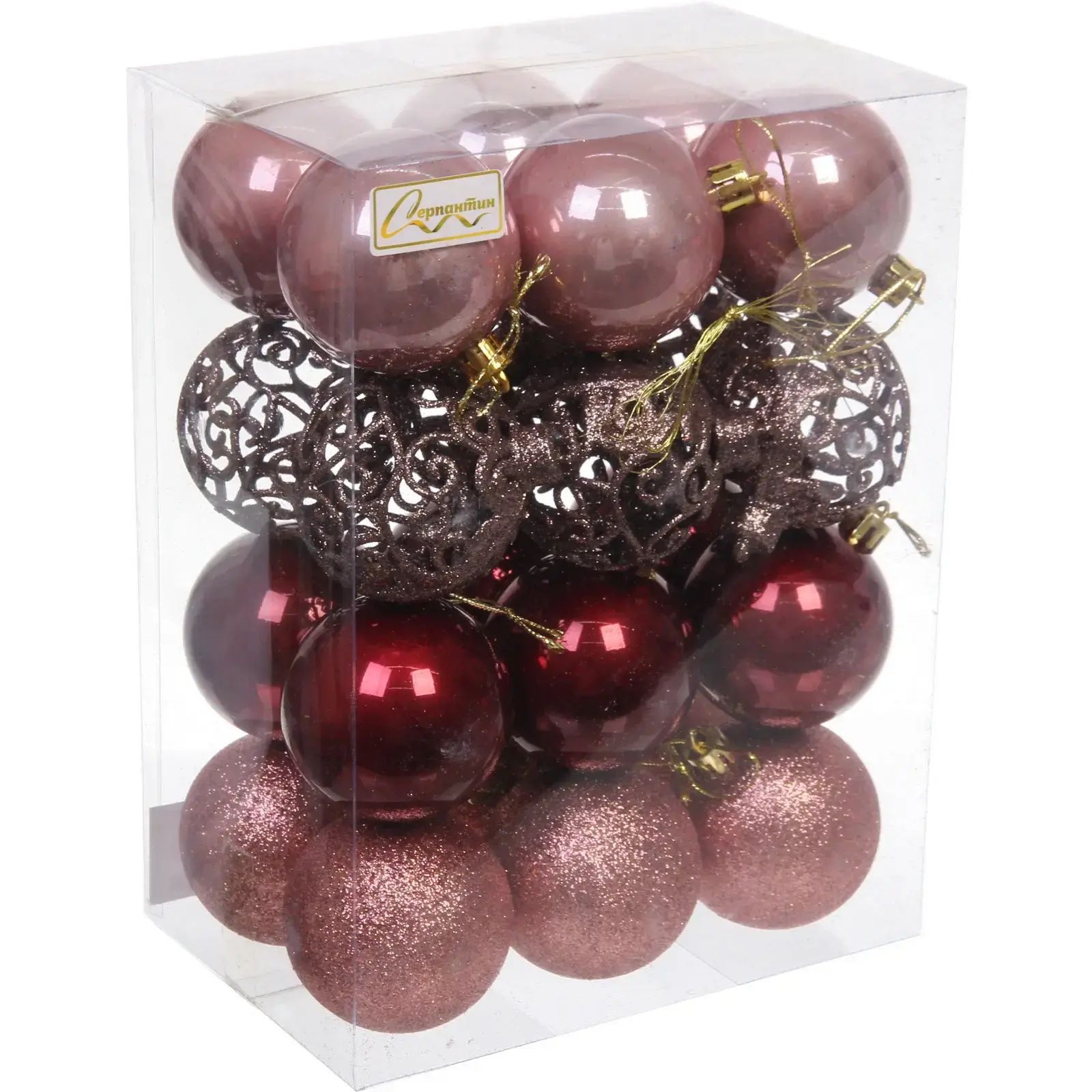 В наборе представлены 24 предмета, включая шары различных форм и размеров. Цветовая палитра включает розовые, красные и золотистые оттенки, что позволяет легко сочетать их с другими элементами декора. Упаковка выполнена в виде прозрачной коробки, что позволяет увидеть содержимое и удобно хранить украшения после праздников.