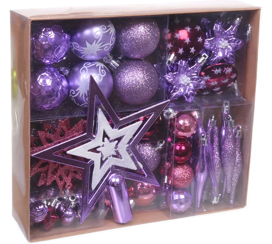 - Полный комплект: 45 украшений разного типа – глянцевые, матовые, блестящие шары, фигурные звёзды и эксклюзивная двойная звёздная верхушка.