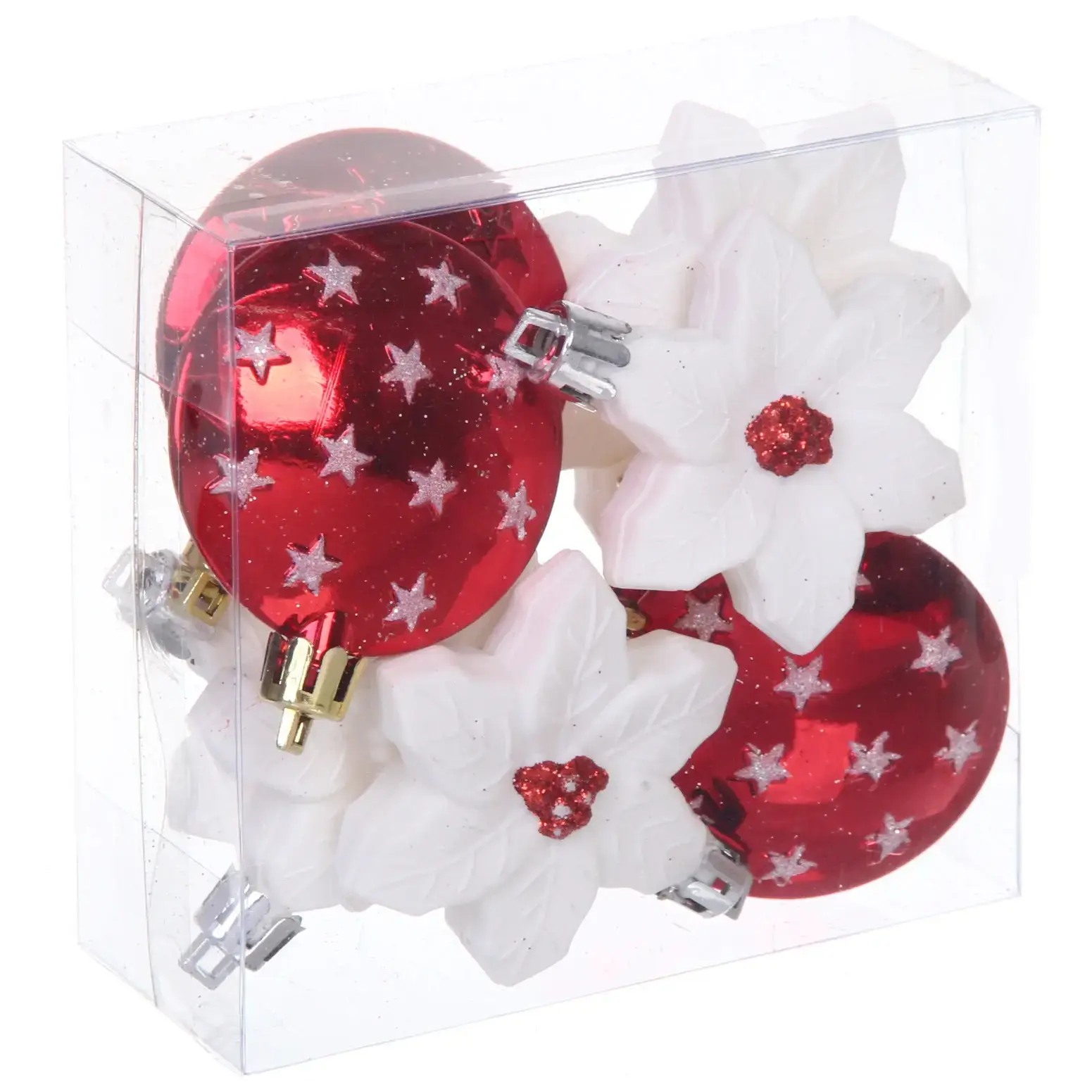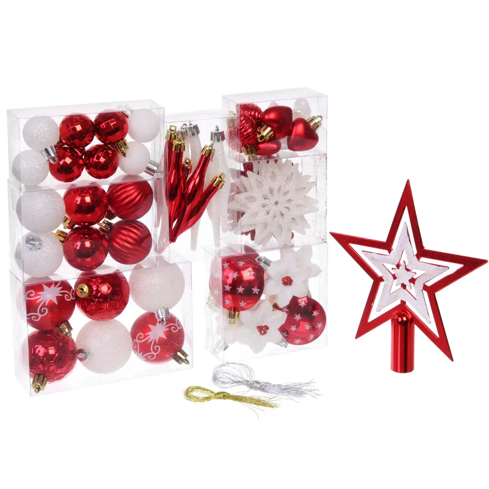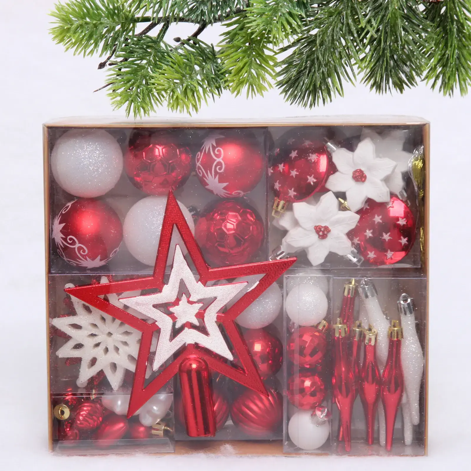 В наборе вы найдёте шары различных форм и размеров, а также декоративные элементы, такие как снежинки и звёздочки. Красные и белые цвета создают яркий контраст, а блестящие поверхности добавляют праздничного блеска. Размеры отдельных элементов не указаны, но они стандартные для новогодних украшений, что делает их универсальными для любого стиля оформления.