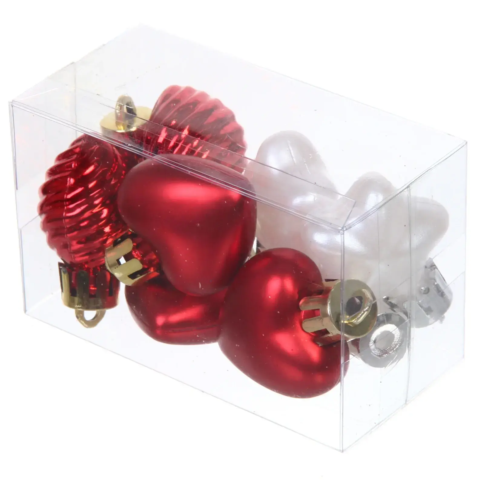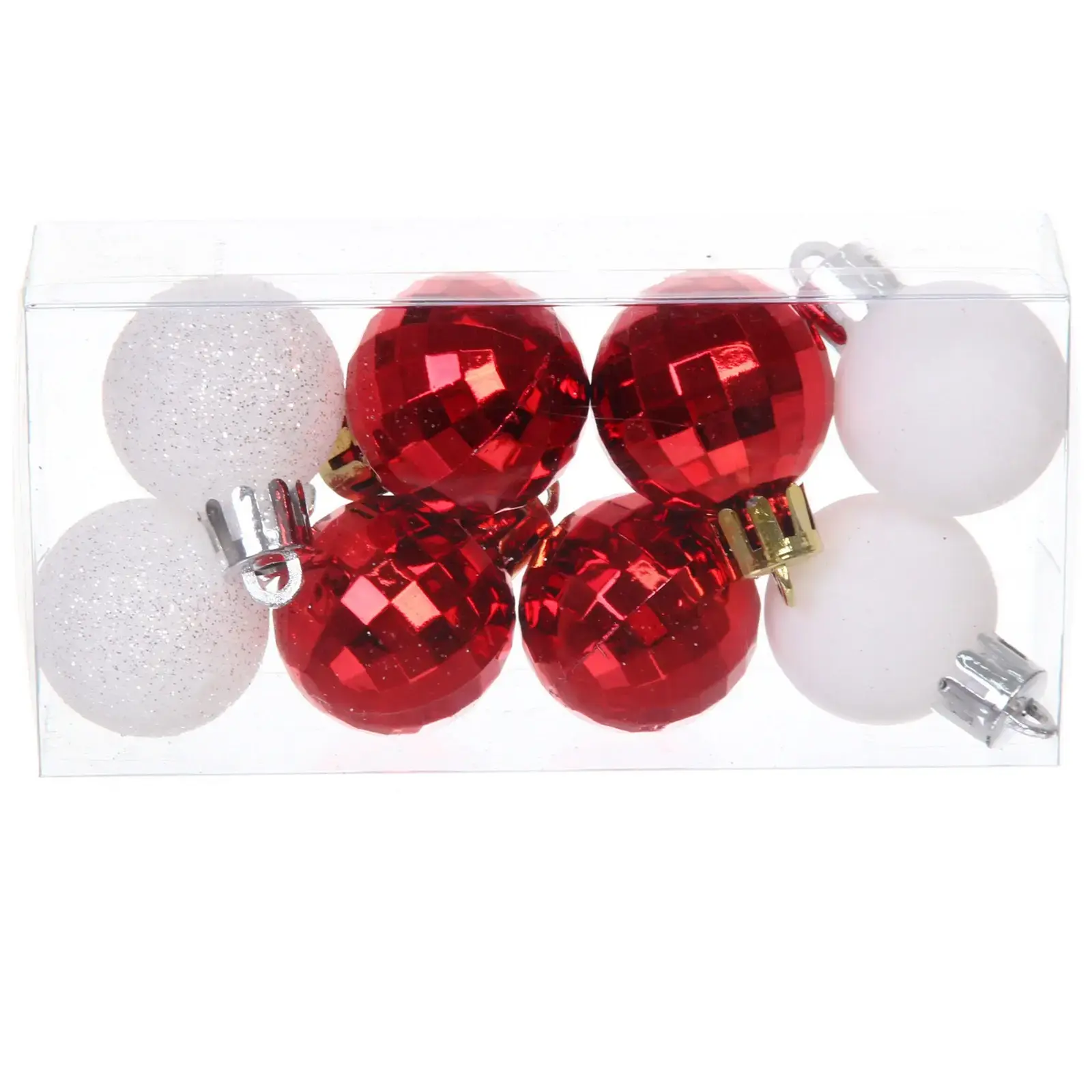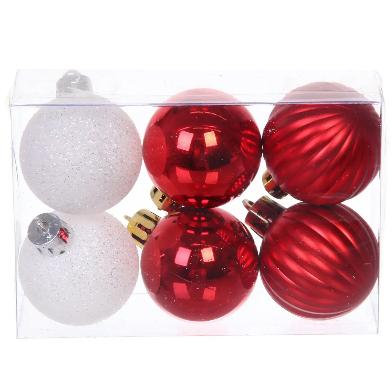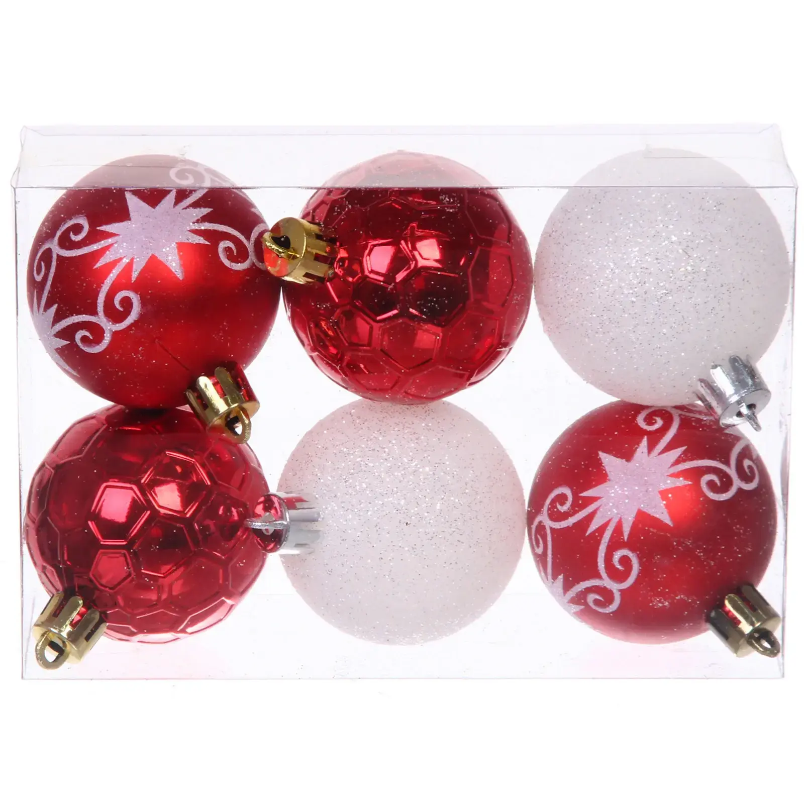 В наборе вы найдёте шары различных форм и размеров, а также декоративные элементы, такие как снежинки и звёздочки. Красные и белые цвета создают яркий контраст, а блестящие поверхности добавляют праздничного блеска. Размеры отдельных элементов не указаны, но они стандартные для новогодних украшений, что делает их универсальными для любого стиля оформления.
